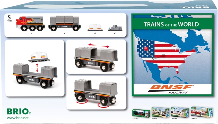 Zestaw zawiera 1× drewnianą lokomotywę, 2× wagony towarowe oraz 2 ładunki dodatkowe (woda i srebrne obciążenie silnika). Dzięki kompaktowym wymiarom świetnie pasuje do większości drewnianych kolejek i wspiera rozwój wyobraźni, małej motoryki oraz umiejętności zabawowych.