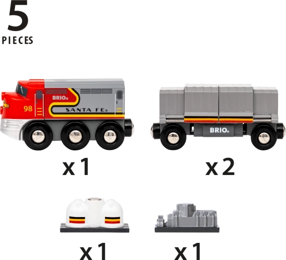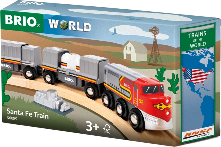 Podaruj dzieciom odrobinę historii kolei z drewnianym pociągiem SANTA FE inspirowanym słynną lokomotywą „Super Chief” z 1937 roku. Ponadczasowy design w barwach Santa Fe Warbonnet oraz solidne, drewniane wykonanie zachwyci małych i dużych miłośników pociągów.