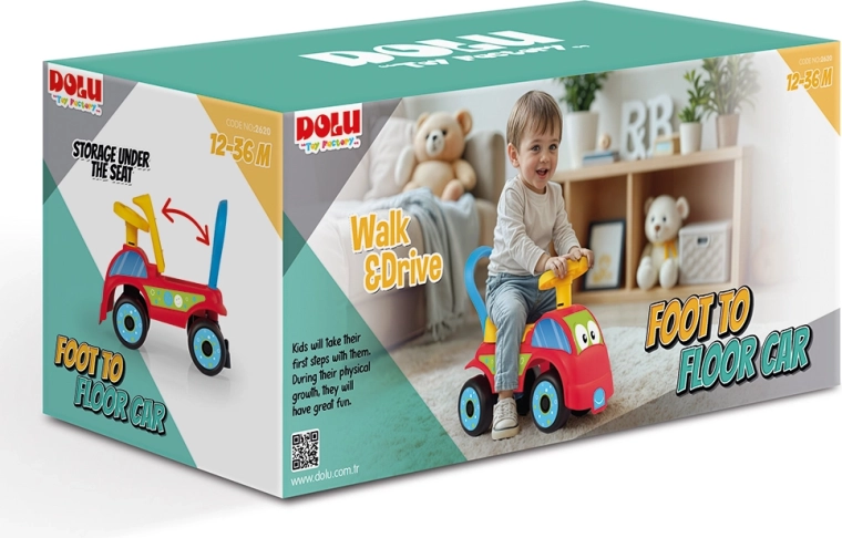 Działający klakson dodaje zabawy, a schowek pod siedziskiem pomieści drobne zabawki lub przekąskę – wszystko pod ręką.