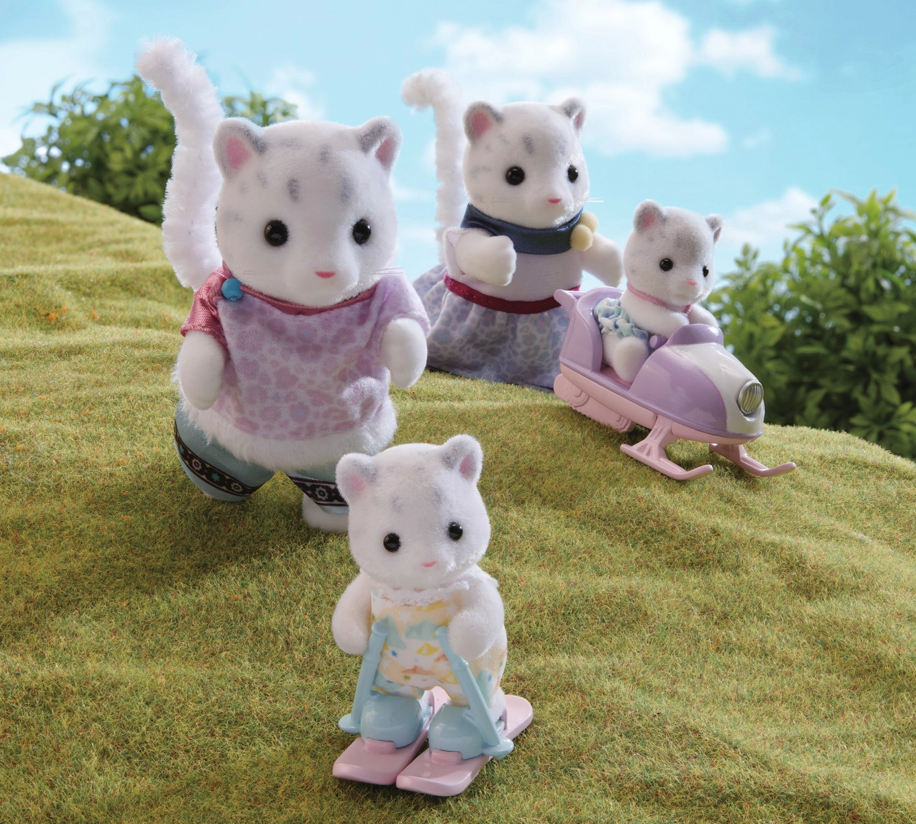Ta dopracowana w szczegółach rodzina śnieżnych lampartów ucieszy dzieci i kolekcjonerów. Mama, tata i dwa kocięta mają miękką, flokowaną powierzchnię oraz charakterystycznie długie ogony. Dzięki zimowym akcesoriom dzieci mogą tworzyć pełne akcji historie na śniegu, jeździć skuterem lub uczyć kocięta jazdy na nartach.