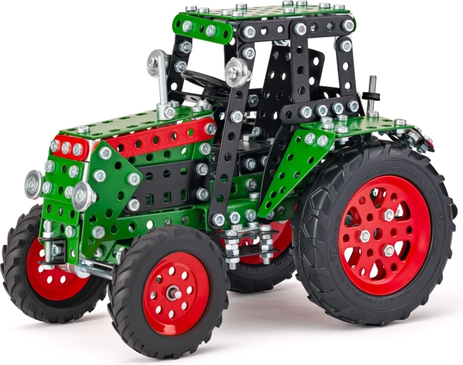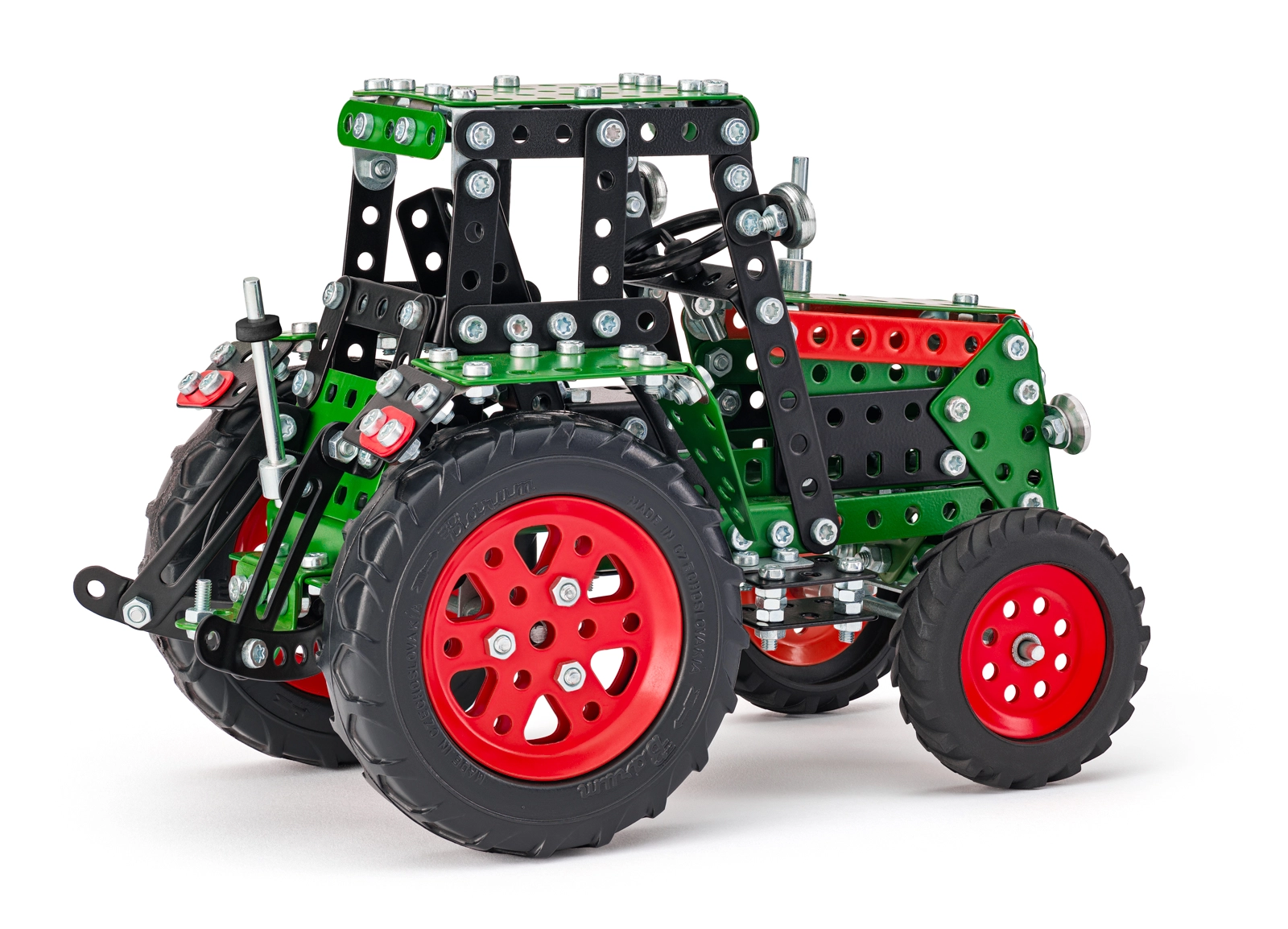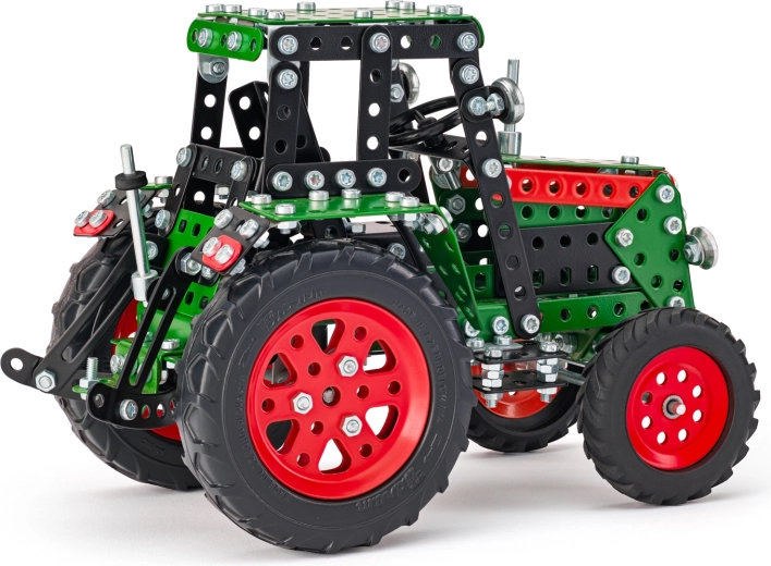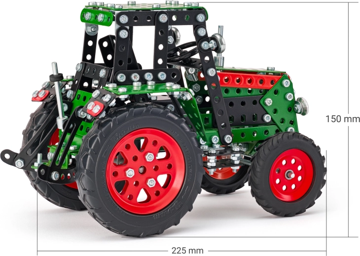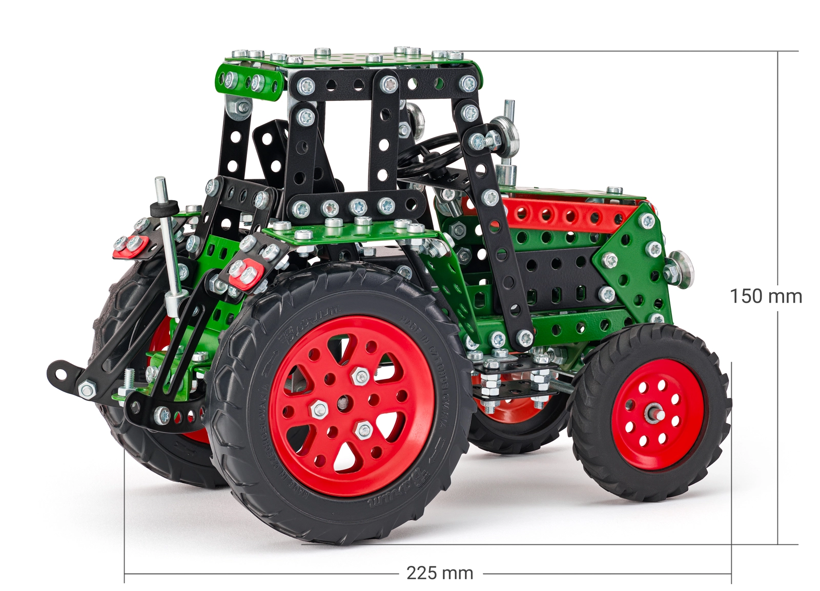 Zestaw MERKUR – Traktor 4x4 to doskonały wybór dla małych i większych konstruktorów. Dzięki solidnym metalowym elementom i łączeniu za pomocą śrubek dzieci zbudują realistyczny zielony traktor 4x4, który wspiera cierpliwość i precyzję podczas montażu.