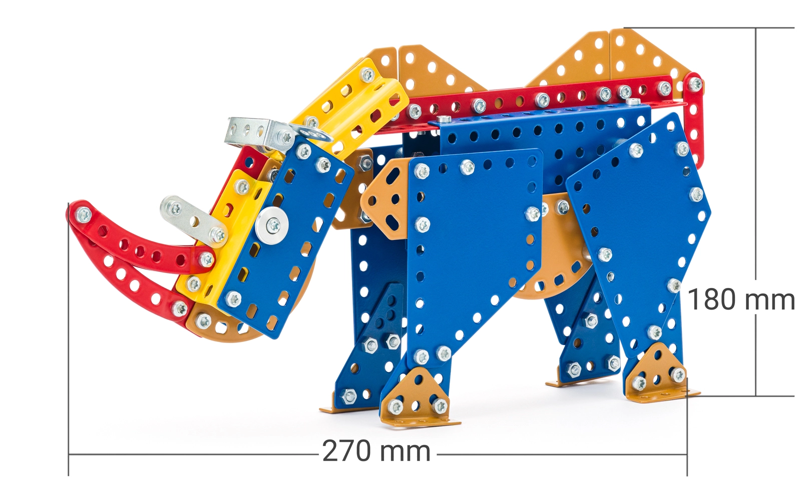 Klocki MERKUR Zoo – nosorożec to świetny wybór dla małych i większych konstruktorów, którzy kochają techniczne wyzwania i zwierzęta. Wysokiej jakości metalowe elementy łatwo łączą się za pomocą śrubek, co pomaga dzieciom rozwijać zręczność i kreatywność. Efektem jest trwały i imponujący model nosorożca, który można wyeksponować.