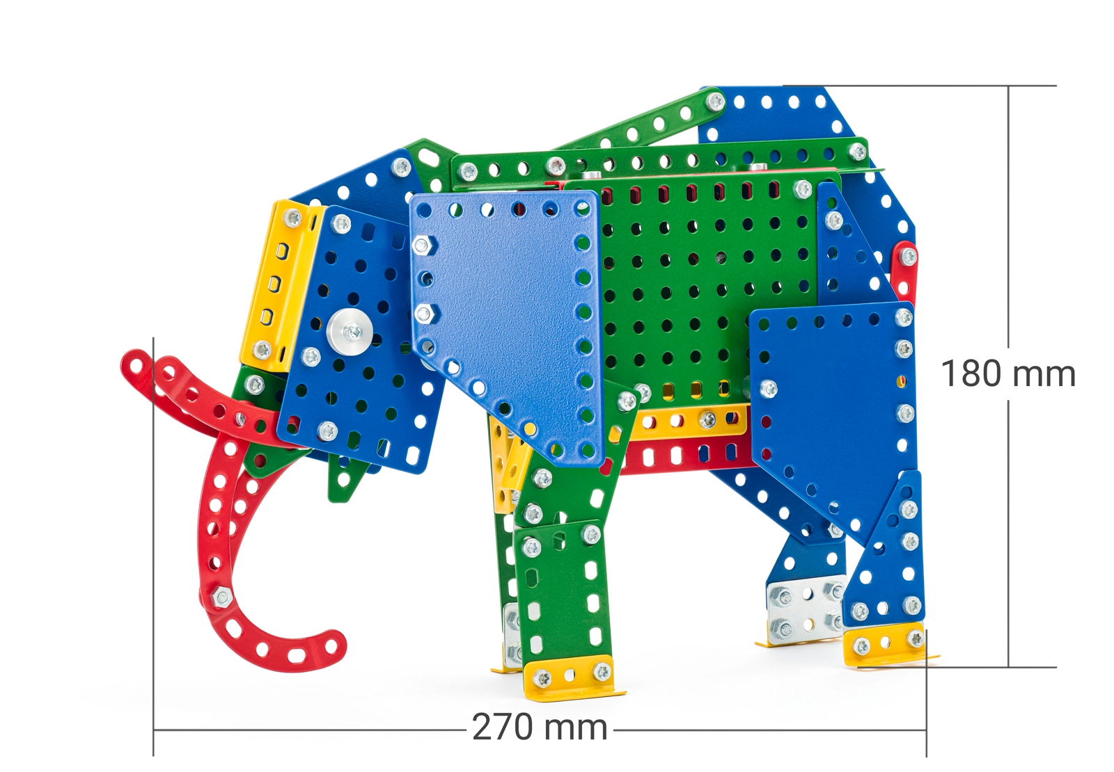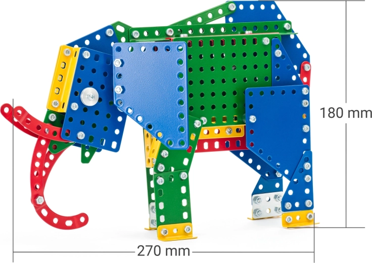 Po złożeniu słoń mierzy około 18 × 7 × 27 cm, więc wyróżni się na półce i w kolekcji modeli. Zestaw przeznaczony jest dla dzieci od 5 lat i wnosi do każdego dziecięcego pokoju wysoką jakość oraz czeską tradycję marki MERKUR.