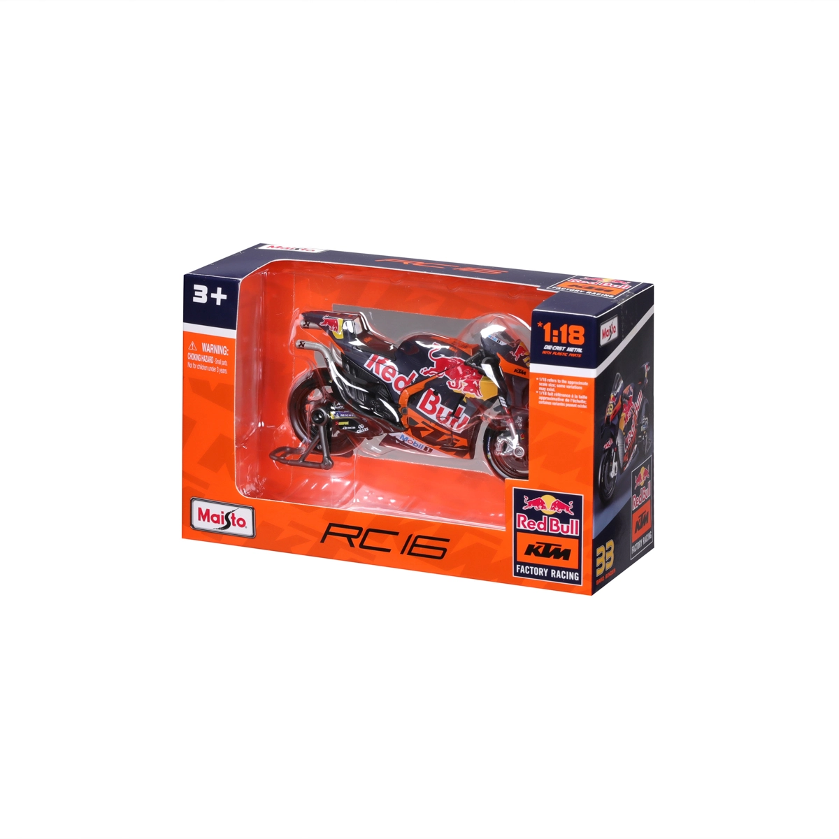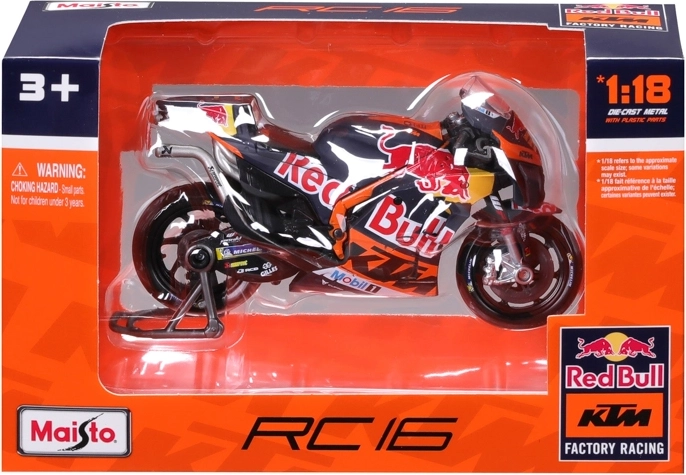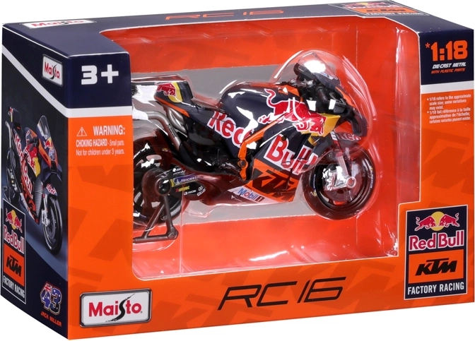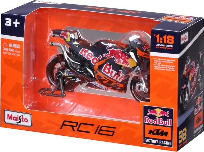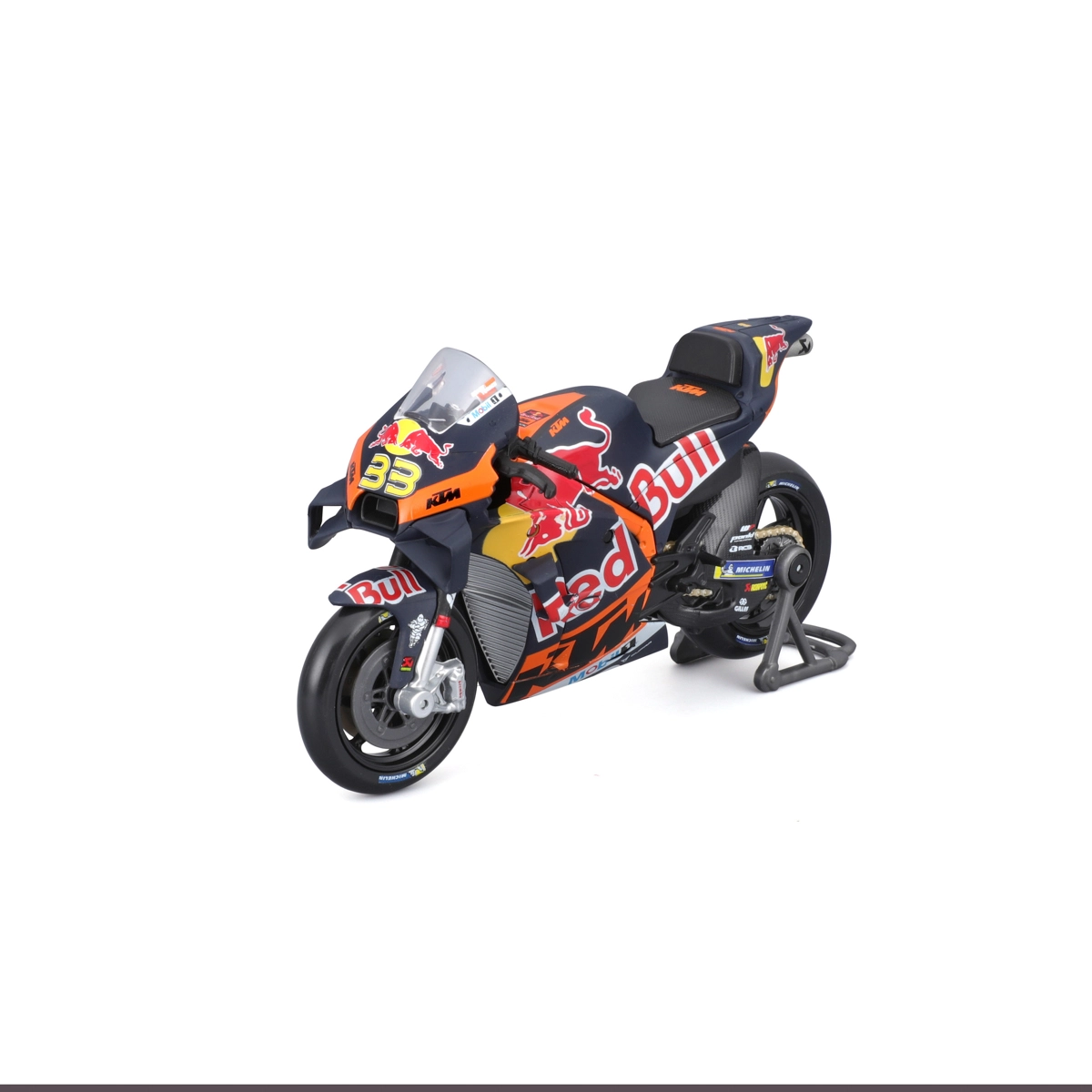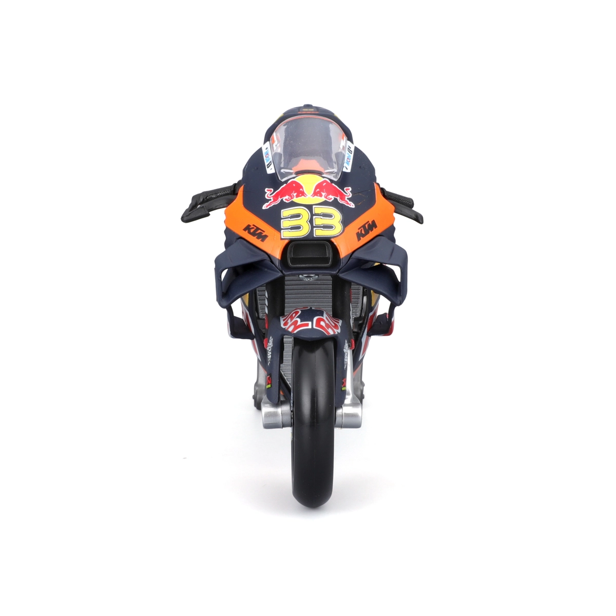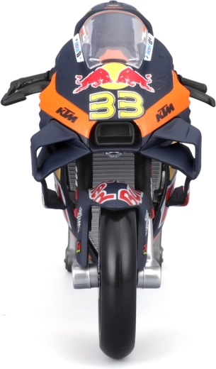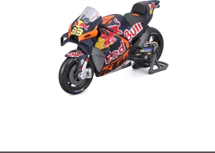 Oficjalnie licencjonowane barwy zespołu RED BULL KTM oraz szczegółowe naklejki z numerem 33 zawodnika Brad Binder zapewniają maksymalny realizm w gablocie i na biurku.