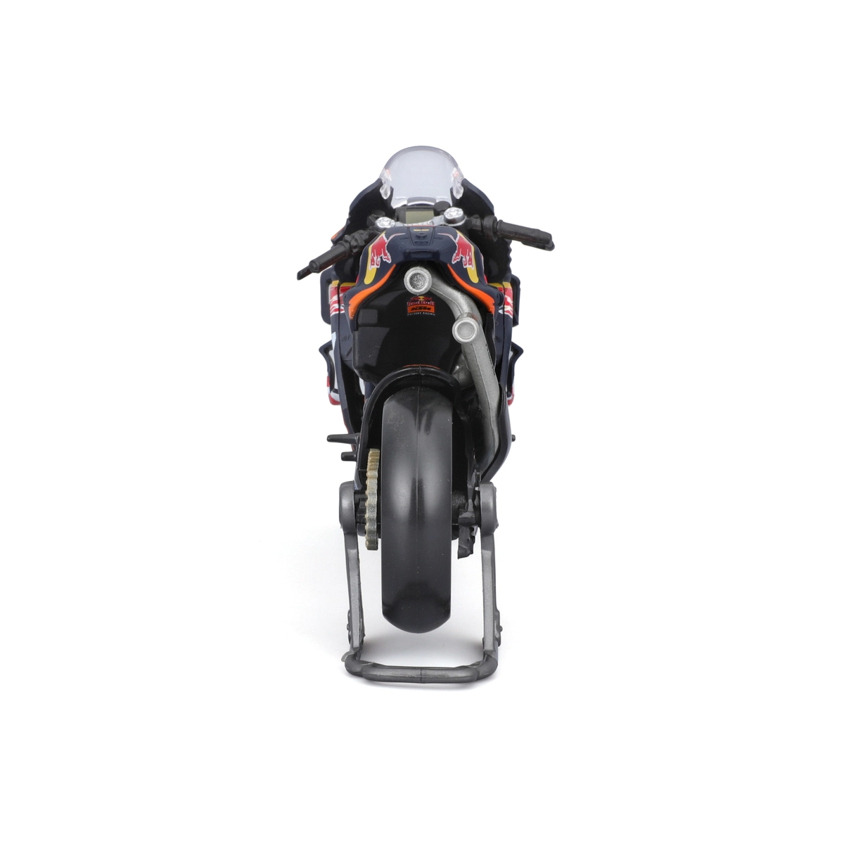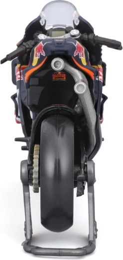 Dzięki obracającym się kołom oraz detalom takim jak tarcze hamulcowe, wydech, kierownica i przezroczyste czołowe plexi model prezentuje się wyjątkowo realistycznie. W zestawie znajduje się również stojak paddock dla stabilnej ekspozycji. Oficjalna licencja gwarantuje wierne barwy i grafikę zespołu RED BULL KTM z numerem zawodnika 33.
