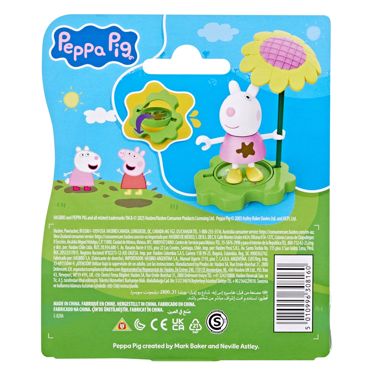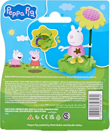 Z tym zestawem dzieci przeniosą się prosto do świata PEPPA PIG. Postać Suzy jest gotowa na harce w kałuży i błocie, parasol słoneczny oraz przeciwdeszczowy dodają zabawie uroku zmiennej pogody. Podstawka zapewnia, że figurka stabilnie stoi podczas każdej przygody.