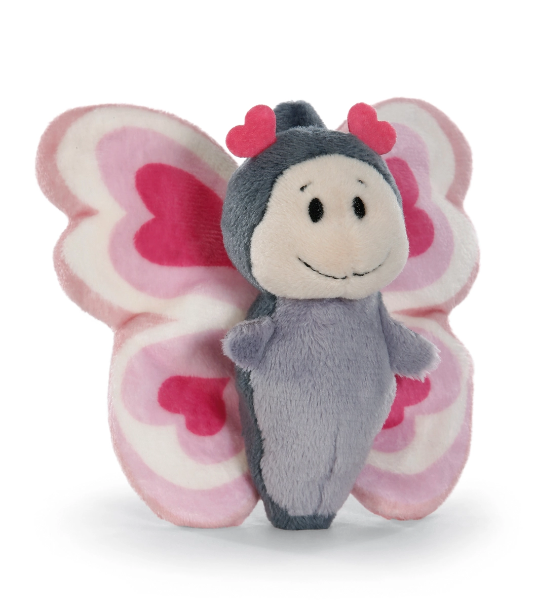 Pluszowy motylek NICI Love z kolekcji Love Classic ucieszy małych i dużych. Łączy mięciutkie szarofioletowe futerko, czułki z serduszkami oraz wyraziste różowo-białe skrzydełka z motywem serc. Dzięki haftowanym oczom i detalom jest odpowiedni także dla najmłodszych dzieci od urodzenia.