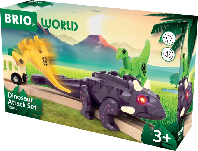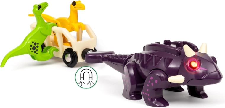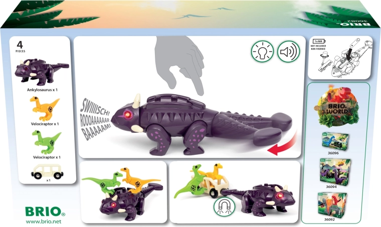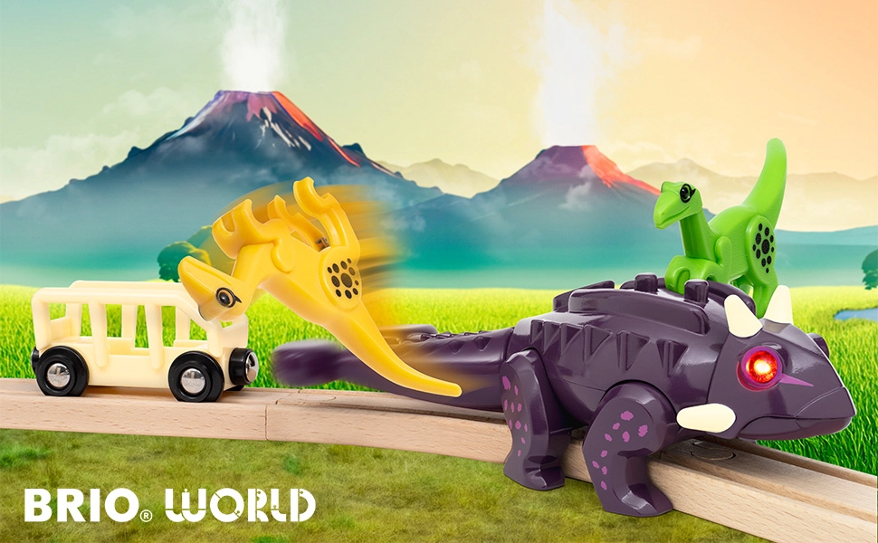 Zestaw pociągowy Atak dinozaurów BRIO wnosi dreszczyk emocji do każdej dziecięcej kolejki. Głównym bohaterem jest solidny ankylozaur z efektami świetlnymi i dźwiękowymi, aktywowanymi ruchem. Dzięki magnesowi w ogonie łatwo podłączysz wagon i wyruszysz na przygodową przejażdżkę przez BRIO World – Świat dinozaurów.