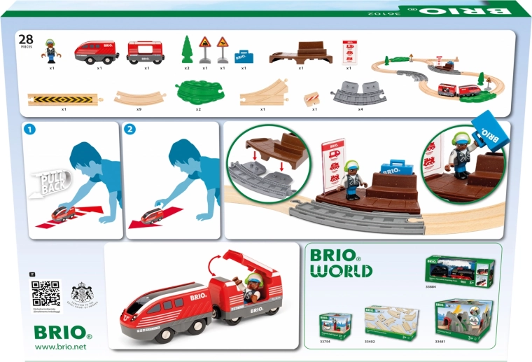 W skład wchodzi 28 elementów: nakręcany czerwony pociąg, wagon pasażerski, figurka, peron, drewniane i sceniczne tory, drzewa, znaki drogowe oraz inne dodatki. Klasyczne magnetyczne sprzęgi BRIO zapewniają kompatybilność z BRIO World i większością drewnianych kolejek.