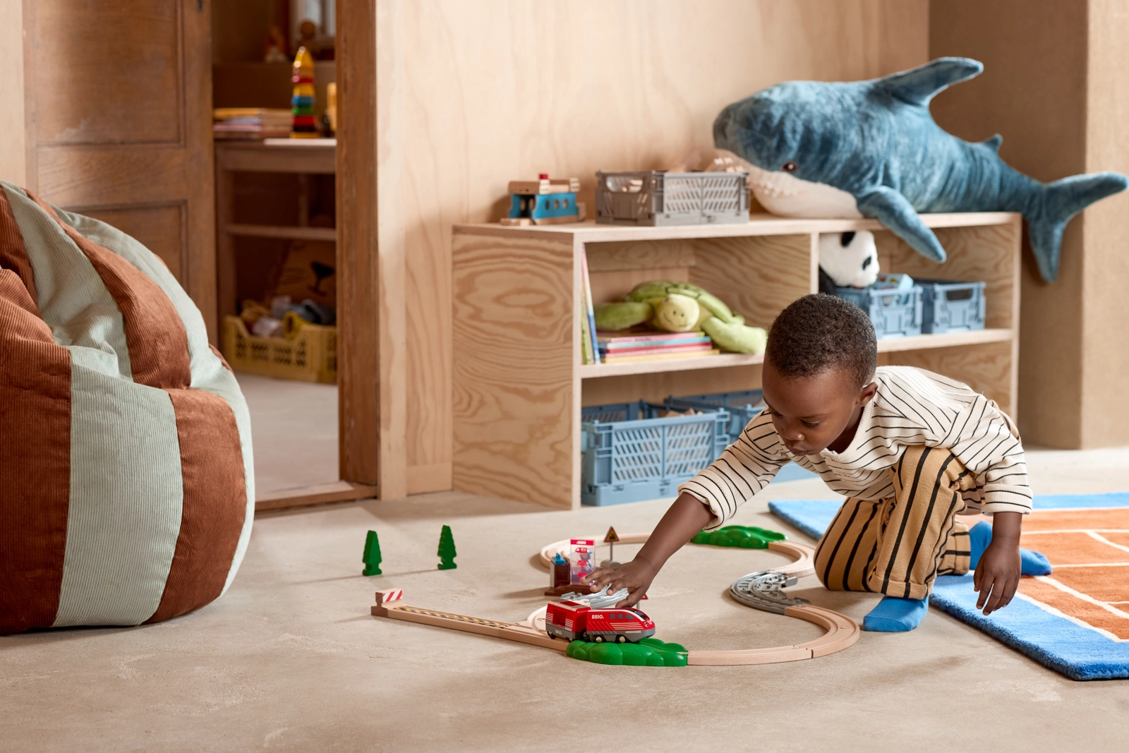 Zakrzywione i proste tory, most, peron, oznakowanie i drzewa pozwalają dzieciom tworzyć różne trasy i rozwijać wyobraźnię.