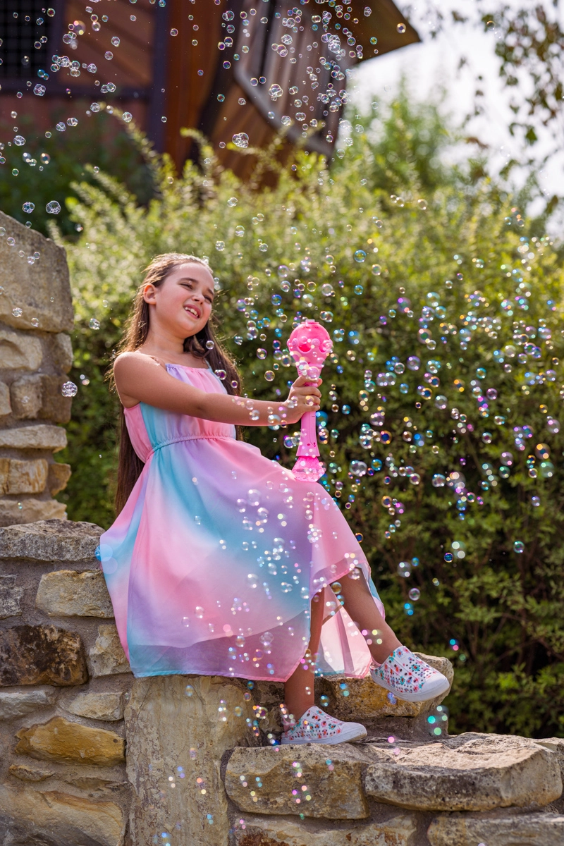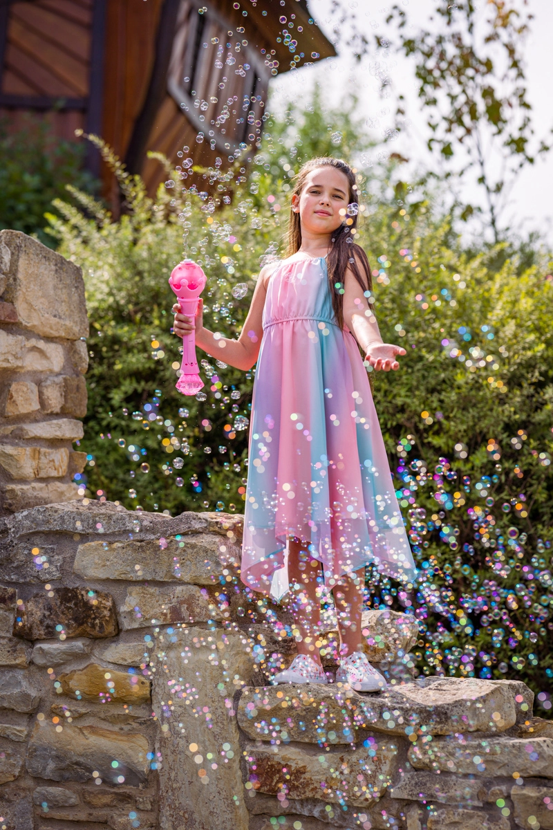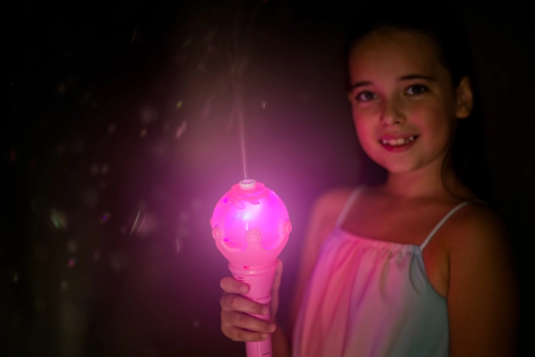 Rozświetli dziecięcą wyobraźnię od pierwszego włączenia: ta magiczna różdżka do baniek tworzy obfity strumień baniek, któremu towarzyszą kolorowe diody LED i wesoła melodia. Ergonomiczna różdżka jest idealna dla małych księżniczek i wszystkich dzieci, które kochają zabawę na świeżym powietrzu oraz wieczorne psoty.