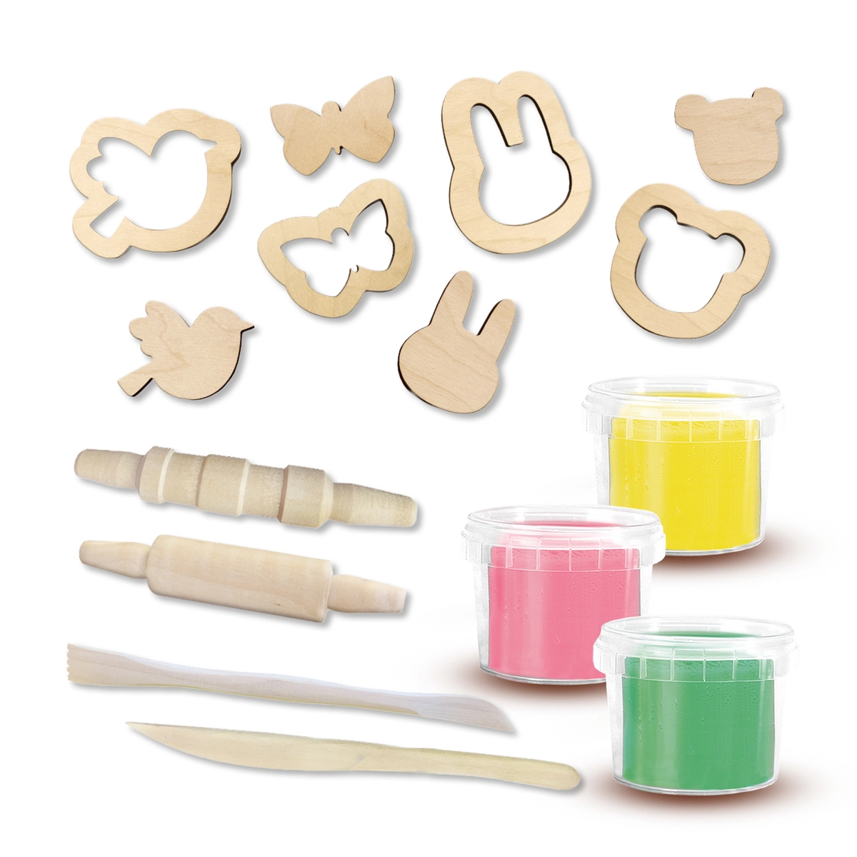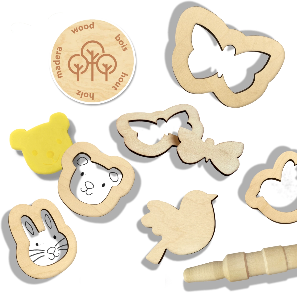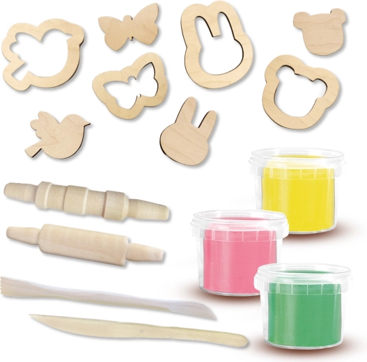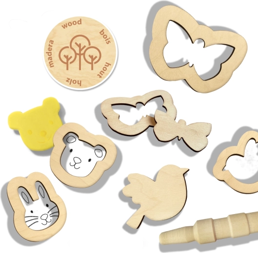 - Bogate akcesoria: 2 drewniane wałeczki (gładki i z rowkami), 2 drewniane nożyki modelarskie (płaski i z rowkami), 4 foremki wykrawające i 4 foremki wytłaczające.