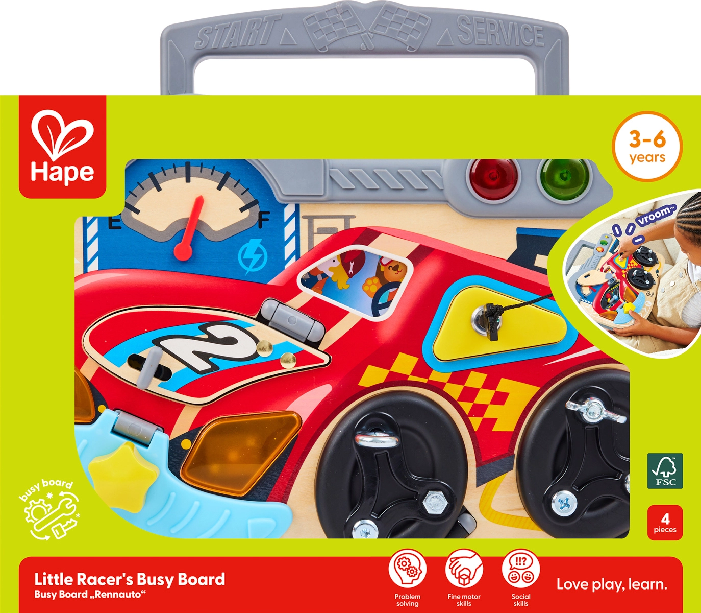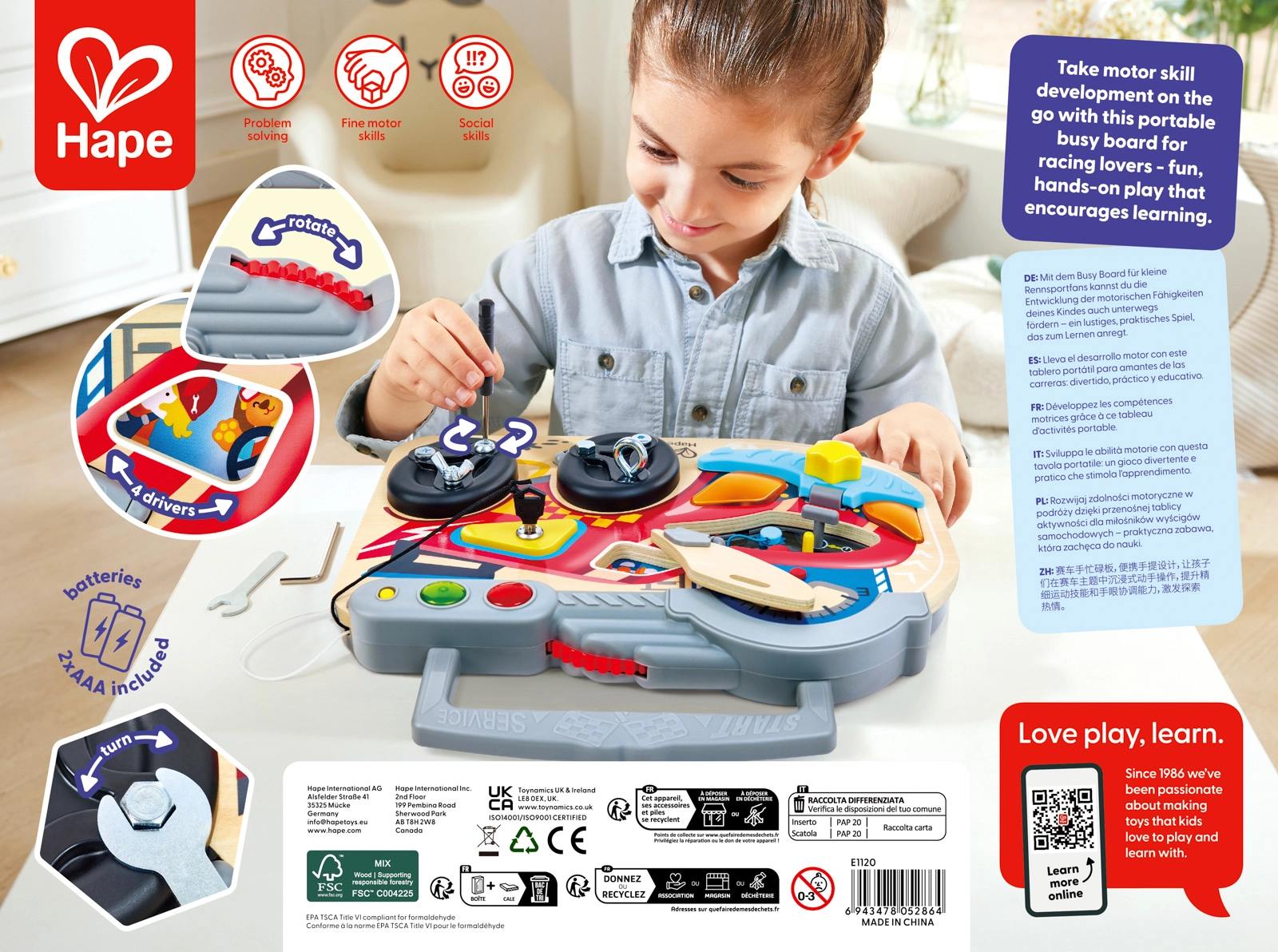Przenośna interaktywna tablica dla małych fanów aut rozwija małą motorykę, myślenie logiczne oraz koordynację oko–ręka. Dzieci będą przykręcać, obracać, przełączać i otwierać zamki, poznają zasadę przyczyny i skutku oraz podstawy przepisów drogowych dzięki sygnalizacji świetlnej. Lekka i poręczna zabawka jest idealna w podróży i zapewnia godziny mądrej rozrywki.