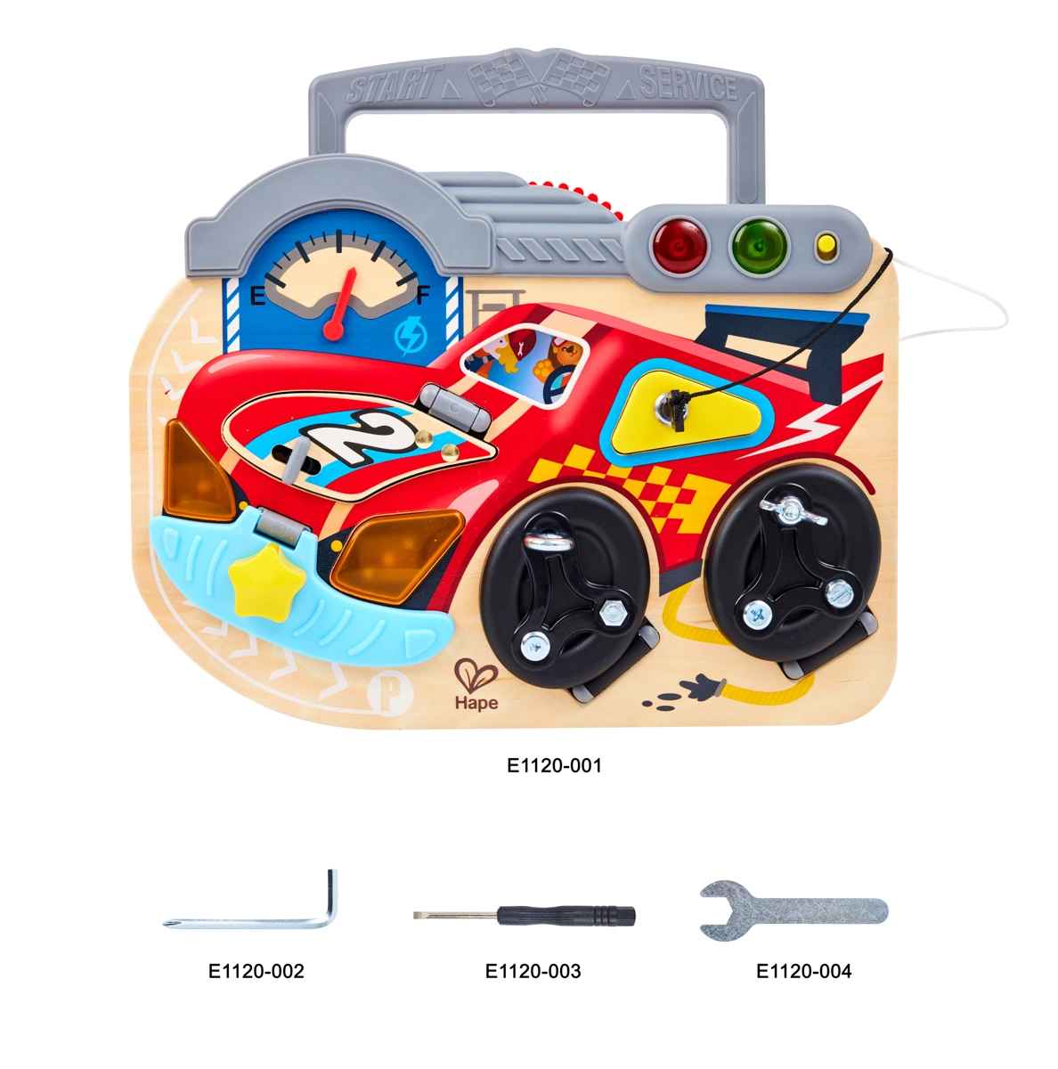 Interaktywna tablica do zabawy Mały kierowca została zaprojektowana jak serwisowa maska auta wyścigowego z wieloma elementami mechanicznymi, które zachęcają dzieci do odkrywania. Pokrętła, śruby i nakrętki, przyciski sygnalizacji oraz zamek z kluczem rozwijają małą motorykę, cierpliwość i zrozumienie związku przyczyna–skutek. Dzięki praktycznemu uchwytowi tablicę łatwo zabrać ze sobą wszędzie.