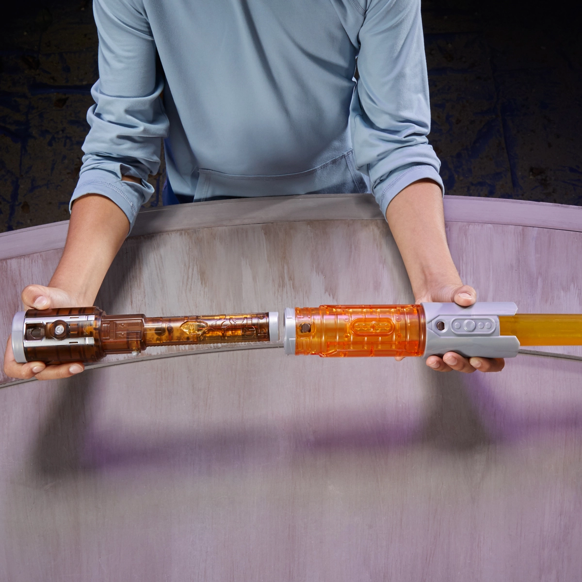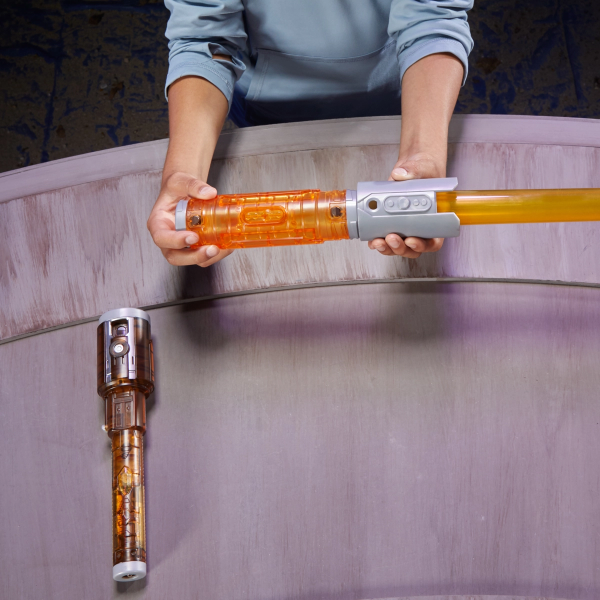 Przezroczysty rdzeń inspirowany kryształem kyber oraz efekt zapalania klingi uzupełniają autentyczne dźwięki dla maksymalnych wrażeń podczas odgrywania ról.