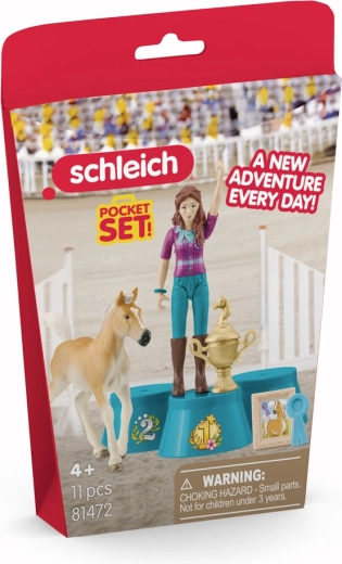 Spraw dzieciom radość zestawem do zabawy Schleich z kolekcji POCKET SET, który przenosi radość ze zwycięstwa prosto do dziecięcego pokoju. Lisa wchodzi na podium, źrebak otrzymuje niebieską wstążkę i razem świętują pierwszy turniej. Wysoka jakość figurek Schleich wspiera realistyczną zabawę i rozwój wyobraźni.