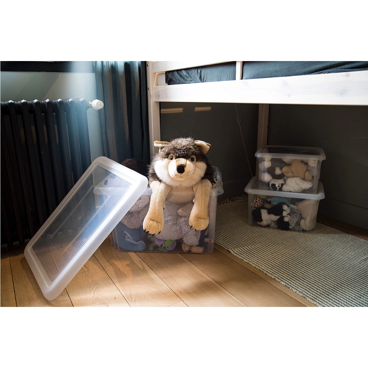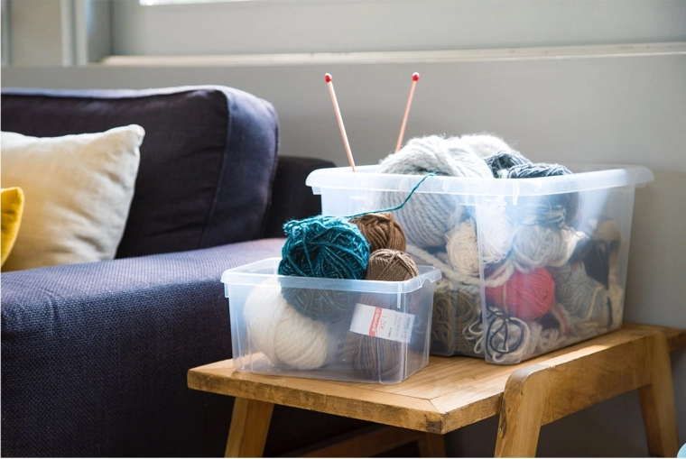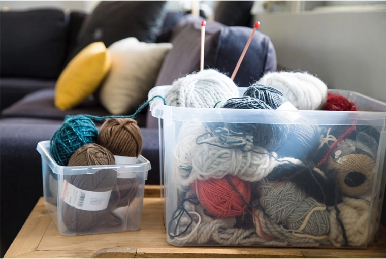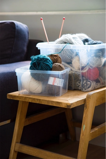 Solidna pokrywa pozwala bezpiecznie układać pojemniki jeden na drugim, maksymalnie wykorzystując podłogę, szafy i przestrzeń pod łóżkiem.