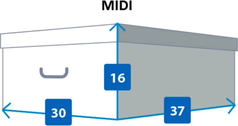 To stylowe pudełko w rozmiarze MIDI łączy atrakcyjny wygląd z wysoką trwałością. Wykonane z kaszerowanej tektury ze 100% recyklingu, ma wzmocnione narożniki i podwójne górne krawędzie dla długiej żywotności. Ściany boczne są połączone plastikowymi nitami, a po bokach znajdują się praktyczne uchwyty ułatwiające przenoszenie. Wieko jest dostarczane złożone, dzięki czemu montaż jest szybki i intuicyjny.