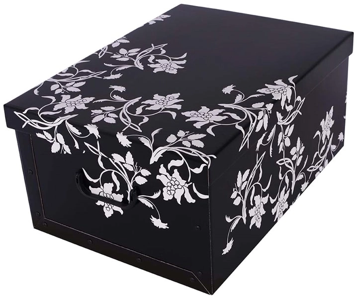 Eleganckie pudełko do przechowywania z wytrzymałej, kaszerowanej tektury z materiałów z recyklingu, w dekorze czarnych barokowych kwiatów. Dzięki solidnej konstrukcji, praktycznym bocznym uchwytom i wieku gotowemu do użycia jest idealne do przejrzystego przechowywania dokumentów, zabawek, książek, ubrań i akcesoriów. Błyszczącą powierzchnię można łatwo czyścić wilgotną ściereczką, a pudełka można bezpiecznie sztaplować.