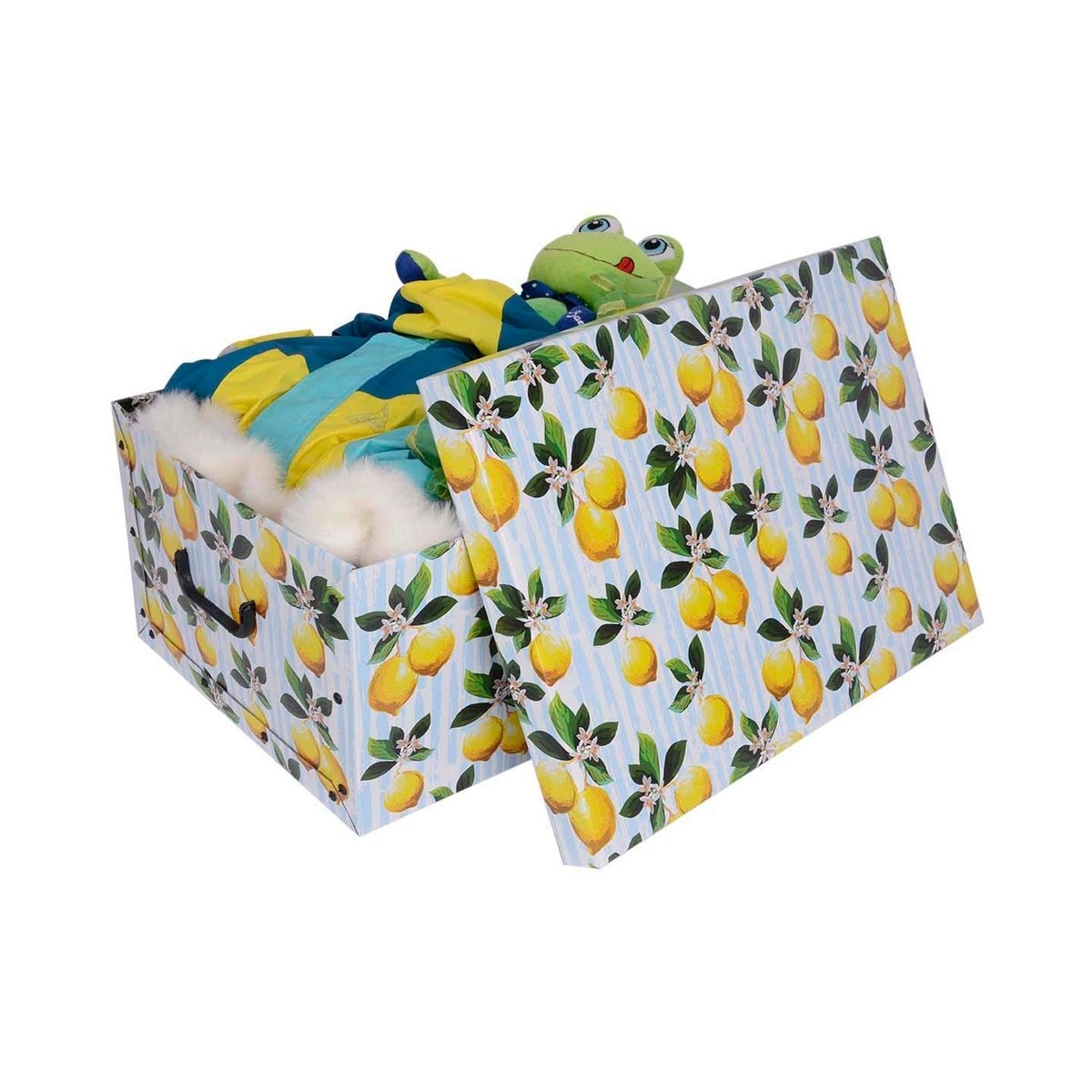 Pudełko MAXI idealnie nadaje się do przejrzystego przechowywania ubrań, dokumentów, zabawek i akcesoriów. Motyw cytryn doda wnętrzu energicznego i świeżego akcentu, a wysokiej jakości wykonanie zapewni długą żywotność i wygodne użytkowanie. Dzięki uchwytom łatwo je przenosić, a do tego pasuje do szafy, regału i otwartych półek.