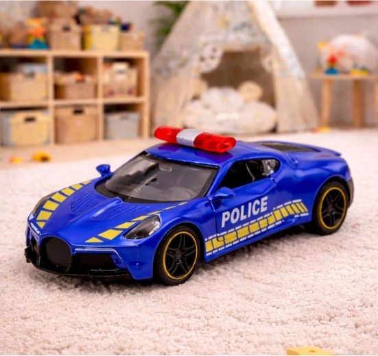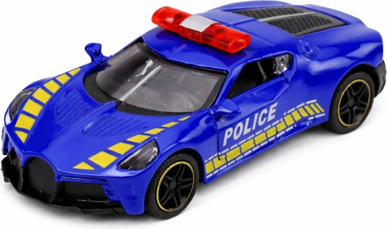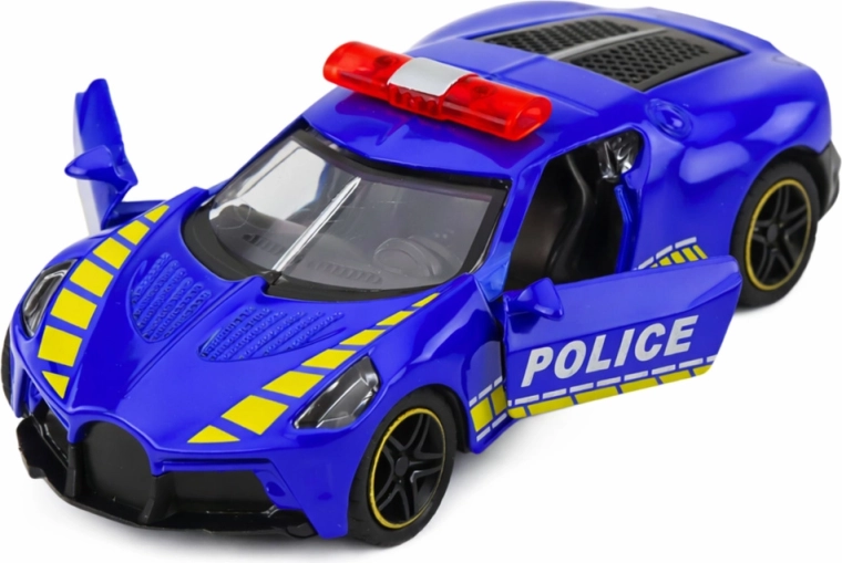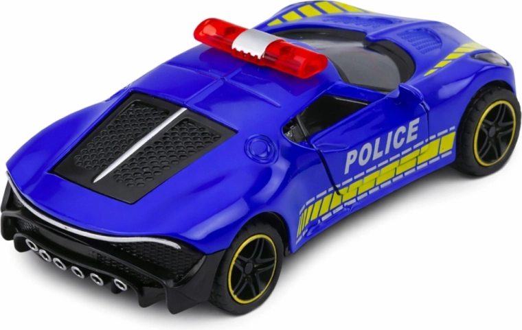 Stylowy policyjny sportowy samochód ucieszy małych fanów szybkich aut, świateł i syren. Dzięki realistycznemu wykonaniu, przezroczystym oknom i sportowemu wzornictwu doskonale wygląda podczas zabawy i na półce młodego kolekcjonera.