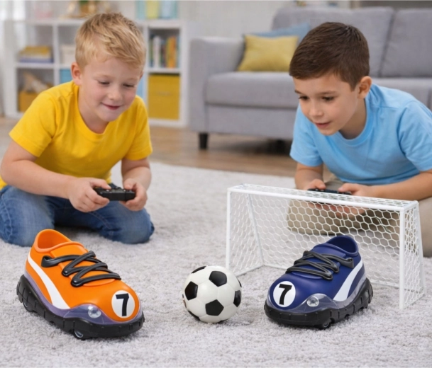Zabawny zestaw dwóch samochodów RC w kształcie sneakersów przenosi domową piłkę nożną na stół i podłogę. Dzieci mogą z pomocą bezprzewodowego pilota rozgrywać własne mecze, trafiać do bramki i ćwiczyć precyzję. Dzięki częstotliwości 2,4 GHz sterowanie jest stabilne, jazda do przodu/do tyłu i skręcanie płynne, a wytrzymała plastikowa konstrukcja wytrzymuje intensywną zabawę. W zestawie znajduje się mini bramka, piłka oraz dwa piloty – idealne dla rodzeństwa i przyjaciół.