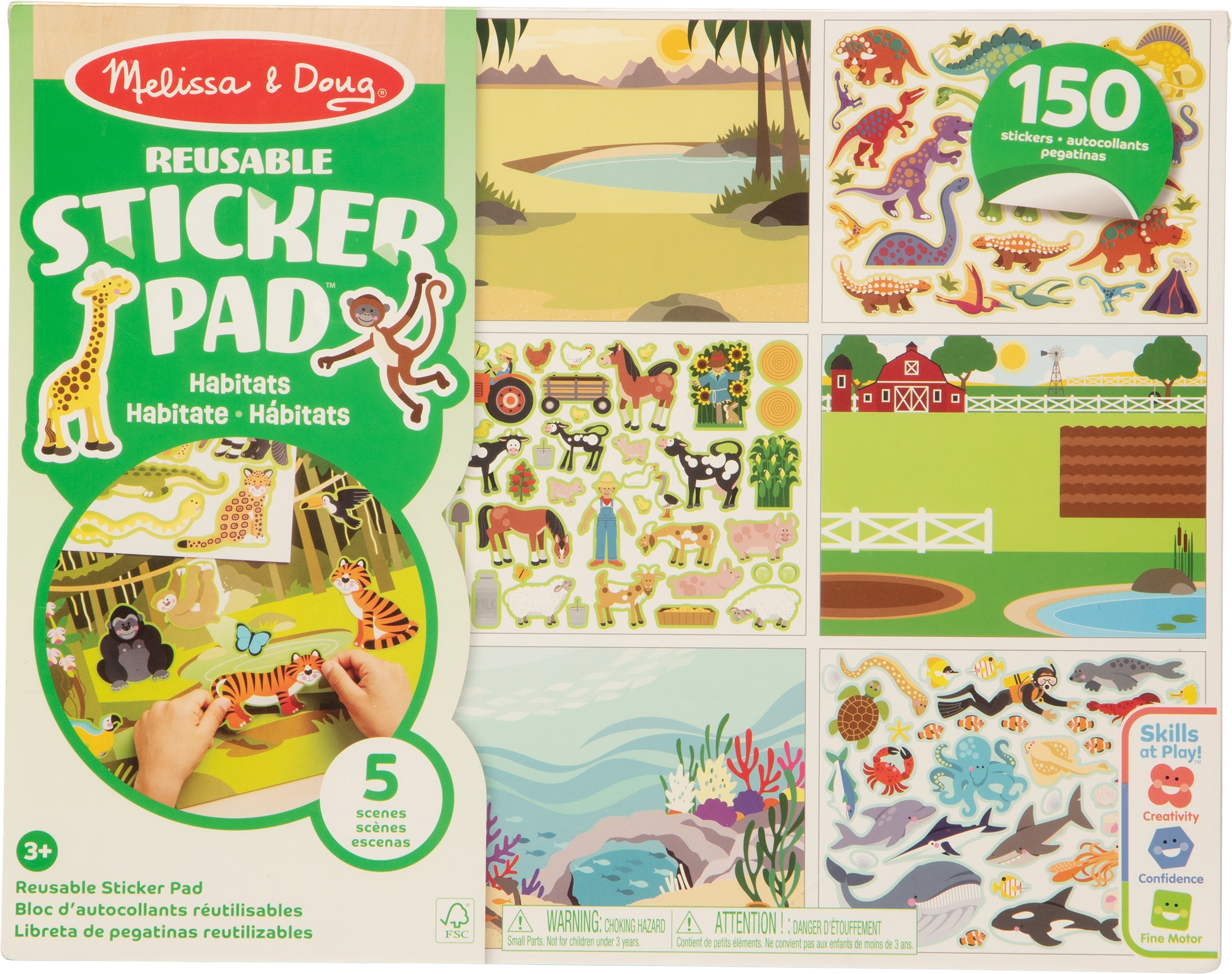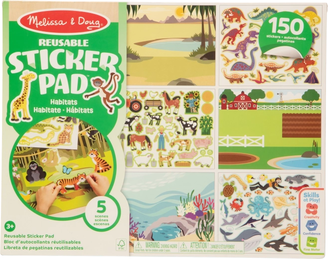 Zabawny zestaw naklejek i scen Sticker Pad ze środowiskami zwierząt od MELISSA & DOUG zawiera 150 naklejek wielokrotnego użytku oraz 5 dużych kolorowych plansz (farma, safari, dżungla, łąka, podwodny świat). Dzieci mogą tworzyć własne opowieści, rozwijać kreatywność i małą motorykę bez bałaganu – idealne także w podróży.