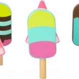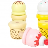 Dzieci wybiorą spośród 12 kuszących „smaków” – 6 gałkowych lodów do rożków i 6 kolorowych lodów na patyku. Rożki z kołeczkiem pozwalają łatwo nakładać i łączyć gałki, co wspiera wyobraźnię i naukę poprzez zabawę. Stoisko można też łatwo wykorzystać jako mobilny stragan do sprzedaży „innych produktów” z dziecięcego asortymentu.