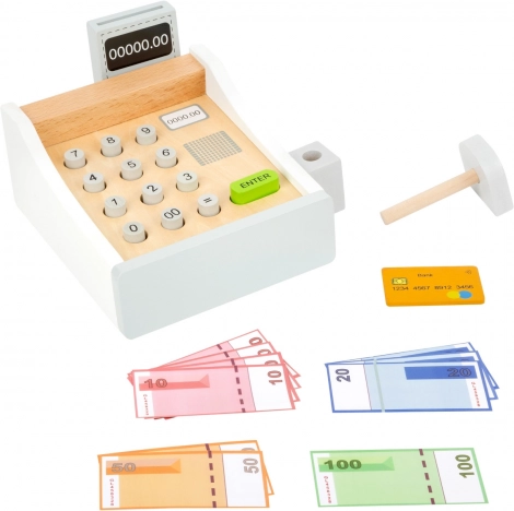 Odkryj wysokiej jakości drewnianą kasę SMALL FOOT, która w zabawny sposób uczy dzieci liczyć, rozpoznawać ceny i trenować umiejętności społeczne podczas zabawy w sklep. Dzięki realistycznym elementom, takim jak skaner, czytnik kart i szuflada na pieniądze, zabawa jest autentyczna i motywuje do aktywnej, sensownej rozrywki.