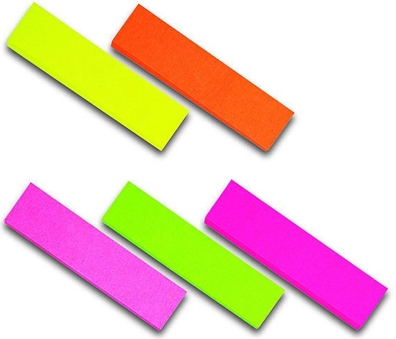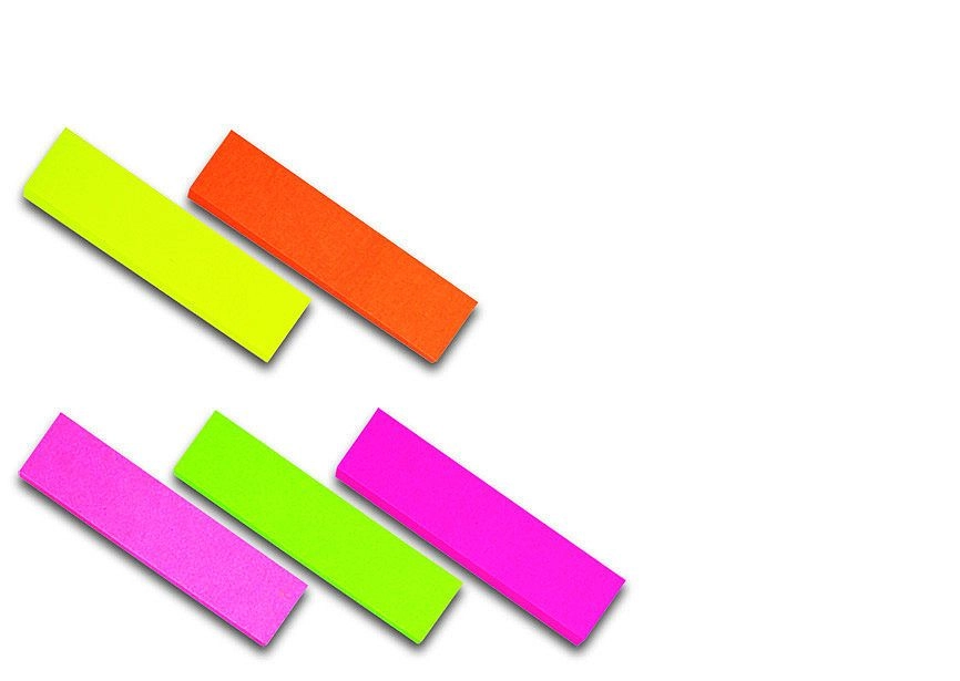 Praktyczne neonowe samoprzylepne zakładki do szybkiego oznaczania i orientacji w dokumentach. Opakowanie zawiera 5 wyrazistych kolorów po 100 kartkach (zielony, żółty, pomarańczowy, różowy, ciemnoróżowy). Zakładki są łatwe do usunięcia bez pozostawiania śladów, a dzięki wymiarom 12 × 50 mm mieszczą się na brzegu stron, zeszytów i książek.