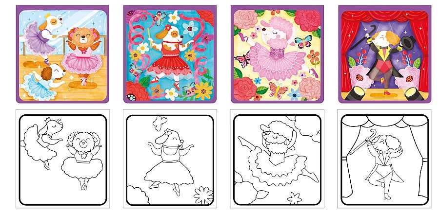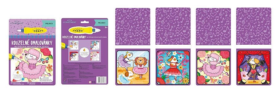 Magiczne kolorowanki CONCORDE Pieski zapewniają dzieciom kreatywną zabawę bez potrzeby użycia tradycyjnych kredek czy farb. Po naniesieniu wody na specjalną powierzchnię na kartonowych stronach natychmiast pojawiają się żywe kolory i urocze motywy piesków. Gdy strony całkowicie wyschną, kolory znikają, a kartki są gotowe do ponownego użycia.