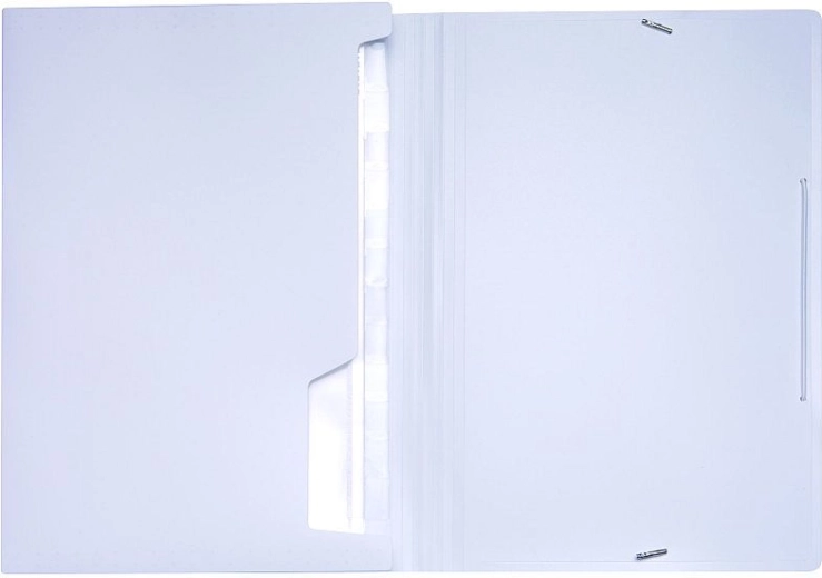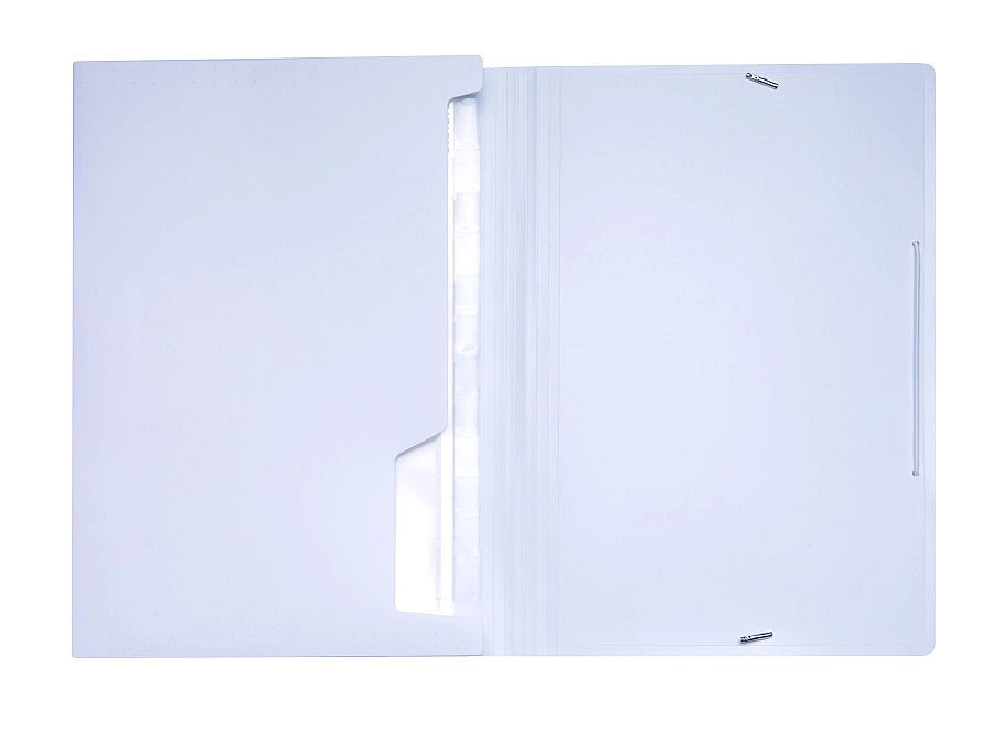 Praktyczne elastyczne zamknięcie niezawodnie utrzymuje zawartość na miejscu podczas przenoszenia i codziennego użytkowania. Minimalistyczny design w białym kolorze idealnie komponuje się z nowoczesnym biurem i nadaje materiałom profesjonalny wygląd.