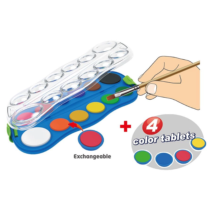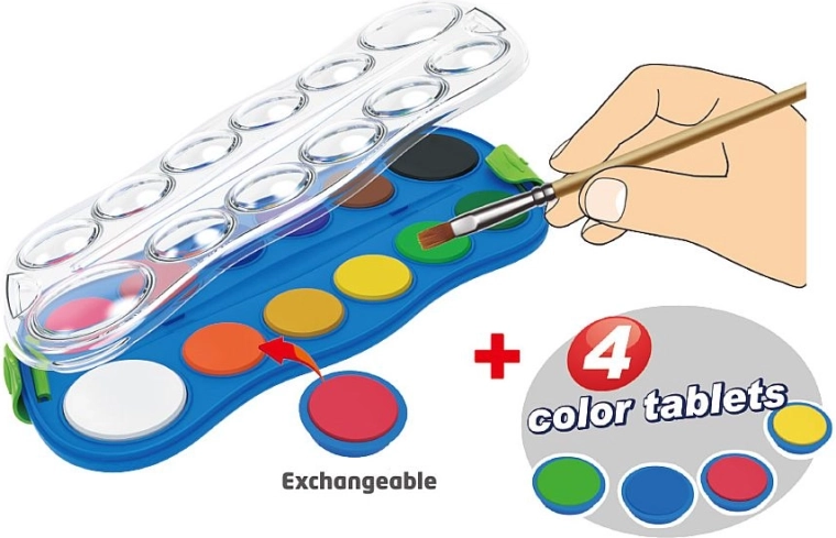 W opakowaniu znajduje się 12 podstawowych kolorów uzupełnionych o 4 wymienne barwy, które poszerzą Twoją paletę możliwości. Farby łatwo się nakładają, dobrze mieszają i nadają się do papieru oraz technik plastycznych z użyciem wody.