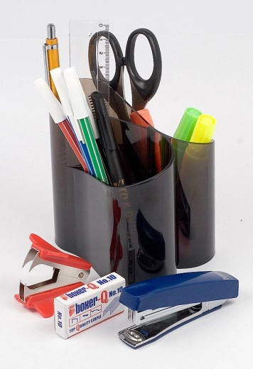 Elegancki stojak na artykuły piśmiennicze z trzema sektorami utrzyma Twoje miejsce pracy w porządku i nada mu styl. Dzięki wykończeniu w kolorze przezroczystej czerni z łatwością wpasuje się w każde biuro i domowy gabinet. 3 przegrody pozwalają oddzielić ołówki, długopisy i drobne narzędzia, a stabilna konstrukcja sprawia, że wszystko pozostaje na swoim miejscu.