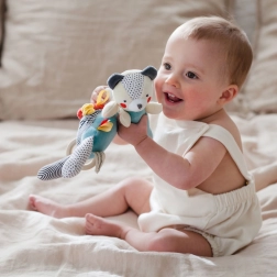 Zrównoważona produkcja jest wsparta użyciem organicznej bawełny z certyfikatem GOTS, materiałów z recyklingu oraz nietoksycznych barwników. Zabawka jest lekka, łatwa do chwytania i bezpieczna dla maluszków 0+, idealna do wózka, łóżeczka i do domu.