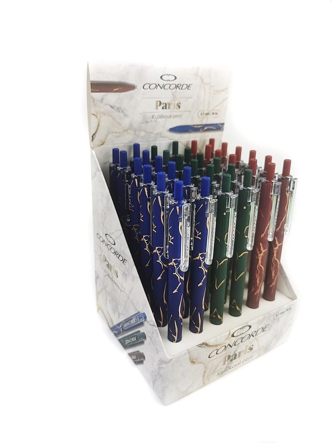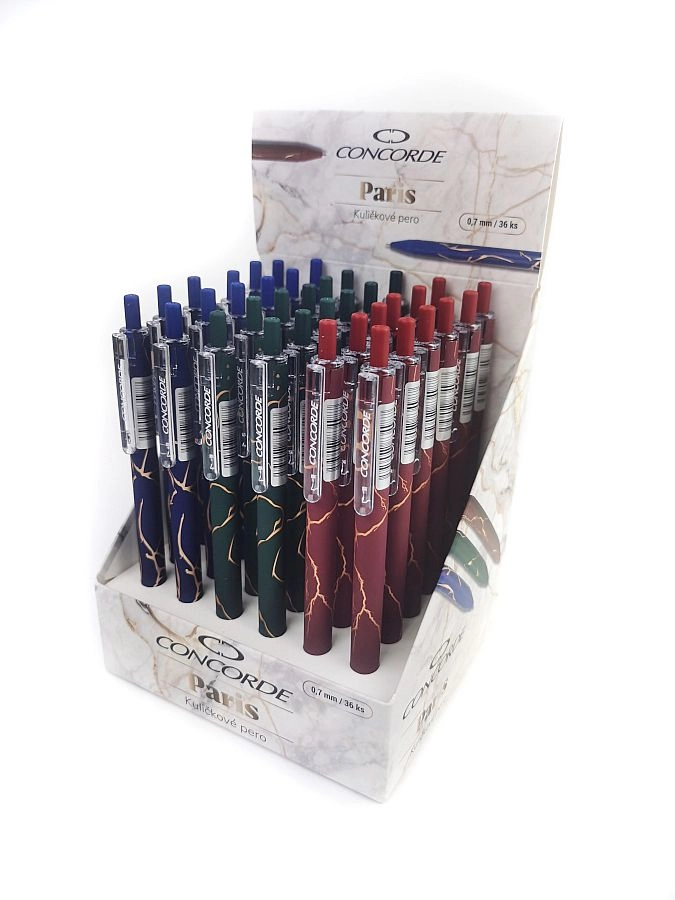 Elegancki długopis CONCORDE Paris w atrakcyjnym marmurowym wzornictwie oferuje gładkie i płynne pisanie dzięki wkładowi żelowemu i końcówce 0,7 mm. Praktyczny mechanizm przyciskowy umożliwia wygodną obsługę jedną ręką. Dostępny w asortymencie trzech kolorów – granatowy, zielony i czerwony – oraz kompatybilny z wkładami wymiennymi Extra i A3.