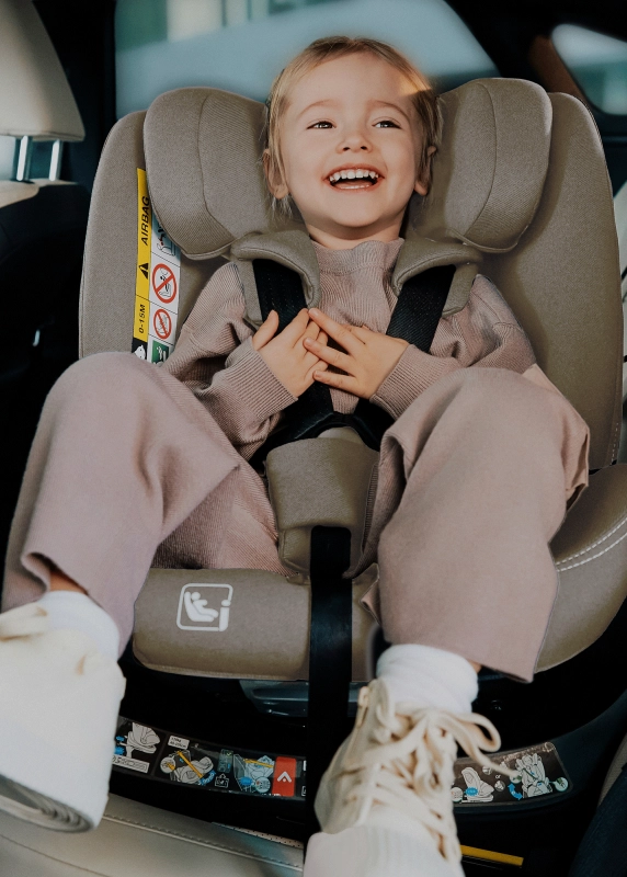 Jednym ruchem obrócisz fotelik w stronę drzwi, wygodnie przypniesz dziecko i ustawisz z powrotem w bezpiecznej pozycji przodem lub tyłem do kierunku jazdy.