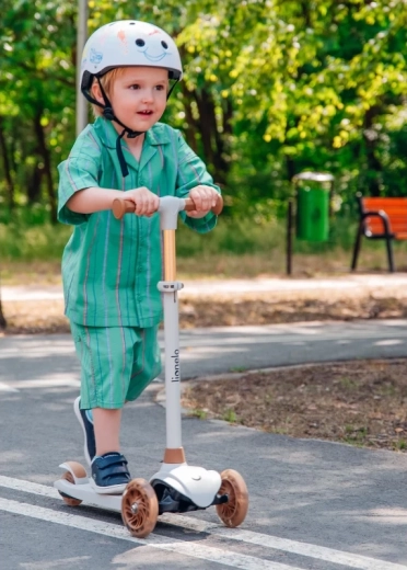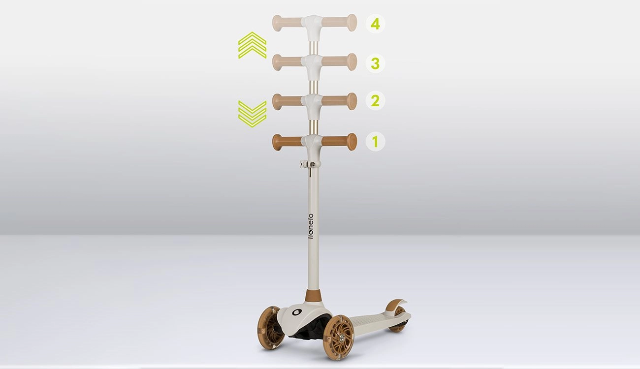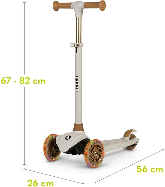 LIONELO Jessy to idealna hulajnoga dla dzieci, które uczą się jeździć i rozwijają równowagę. Stabilna trójkołowa konstrukcja z dwoma przednimi kołami pomaga budować pewność, a niski i szeroki podest z antypoślizgową powierzchnią gwarantuje bezpieczne wsiadanie i zsiadanie. Dzięki kółkom LED, które świecą w trakcie jazdy, dziecko jest lepiej widoczne, a jazda staje się jeszcze bardziej zabawna.
