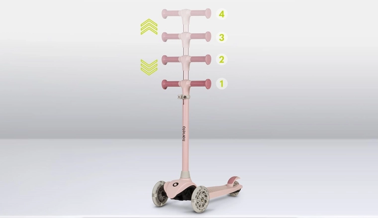 Łatwo ustawisz wysokość kierownicy T-bar w czterech krokach (ok. 65–80 cm), dzięki czemu hulajnoga posłuży dłużej i dopasuje się do wzrostu dziecka.