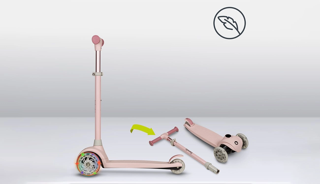 Regulowana wysokość kierownicy w czterech krokach rośnie wraz z dzieckiem, łożyska ABEC-7 dbają o płynną jazdę, a światła LED w kołach zapalają się podczas ruchu – bez baterii. Ogranicznik kąta skrętu 65° wspiera bezpieczniejsze prowadzenie toru jazdy i naukę prawidłowego pochylania przy skręcaniu.