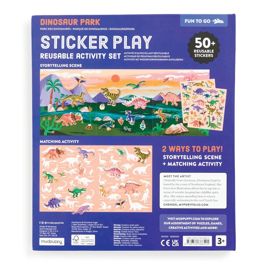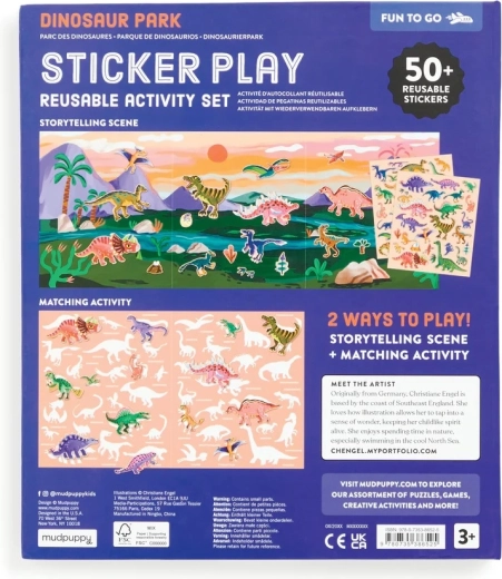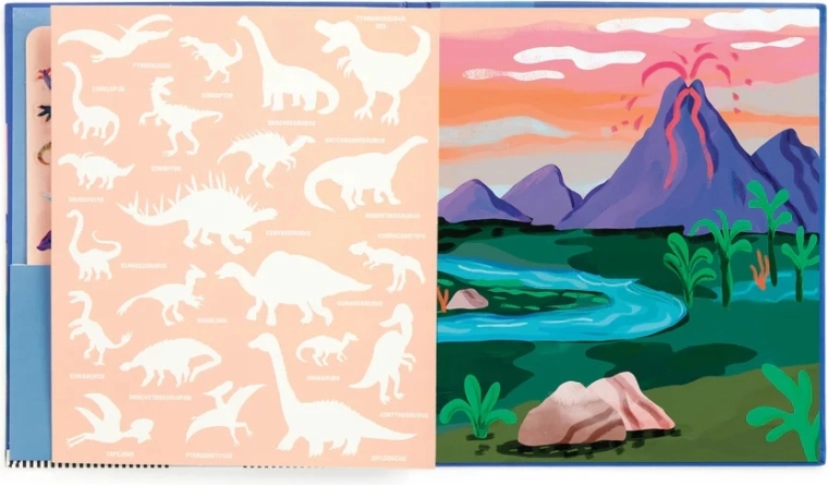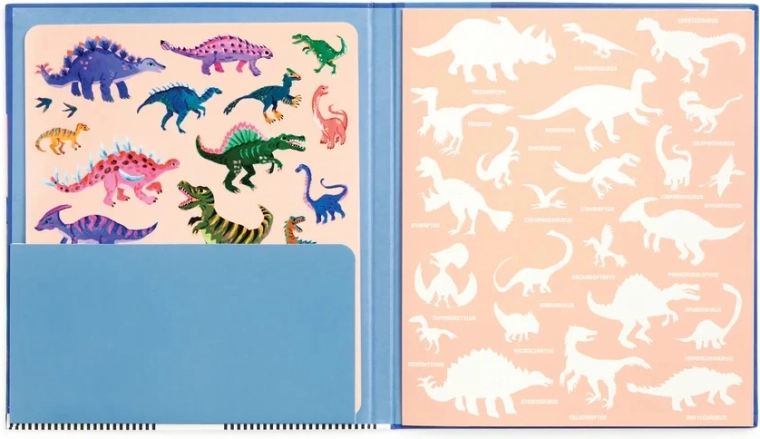 Odkryj barwny prehistoryczny świat, w którym ożywają T‑Rex, Triceratops i inni dinozaurowi przyjaciele. Dzieci mogą dowolnie przyklejać, przenosić i ponownie używać naklejek – sceny powstają i zmieniają się w mgnieniu oka. Rozkładane tło oferuje przestronną powierzchnię do zabawy i opowiadania.