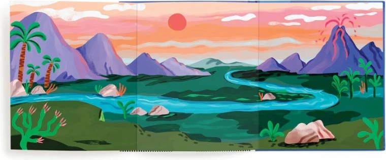 Kolorowe tło z rzeką, górami i wulkanem zapewnia dużo przestrzeni do zabawy i snucia prehistorycznych przygód.