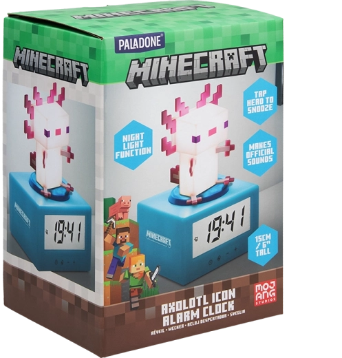 Stylowy budzik z motywem aksolotla z gry MINECRAFT ożywi każdą szafkę nocną. Oferuje analogową tarczę z dobrze czytelnymi cyframi, kompaktową plastikową konstrukcję oraz praktyczny przycisk sterujący do budzika i ewentualnego podświetlenia. Idealny prezent dla dzieci i dorosłych, którzy kochają pikselowy design i chcą niezawodnie wstawać. Zasilanie zapewniają 3× baterie AA (nie są częścią zestawu).