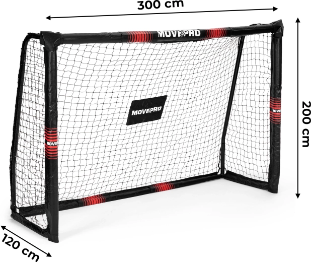 Solidna bramka piłkarska MOVEPRO o wymiarach 300 × 200 × 120 cm do ogrodu i na boisko. Oferuje stalową ramę z powłoką proszkową, wytrzymałą siatkę PE o gęstym splocie, piankowe osłony dla bezpieczniejszej gry oraz kotwy w kształcie U dla stabilności. Dzięki szybkiemu systemowi click‑in bramkę łatwo złożysz i przeniesiesz. Idealna dla dzieci i dorosłych, do treningu celności i rekreacyjnych meczów.