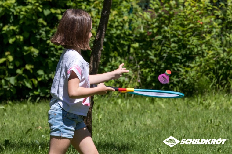 Uniwersalny zestaw marki SCHILDKRÖT łączy ulubione sporty rakietowe – tenis i badminton – w jedną, zabawną grę dla całej rodziny. Dzięki ramie z elastyczną siatką do odbicia potrzeba mniej siły, dlatego zestaw jest idealny dla dzieci i początkujących. W opakowaniu znajdziesz 2 duże rakiety (62,5 cm), miękką piłkę oraz kolorowego lotkę badmintonową do gry na zewnątrz i w domu.