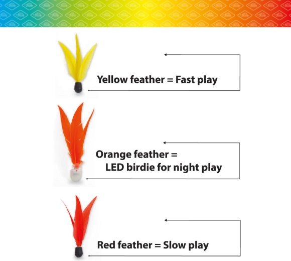 - Czerwona piłeczka – wolniejszy lot: nieco większa, odpowiednia na krótsze dystanse i kontrolowaną grę.