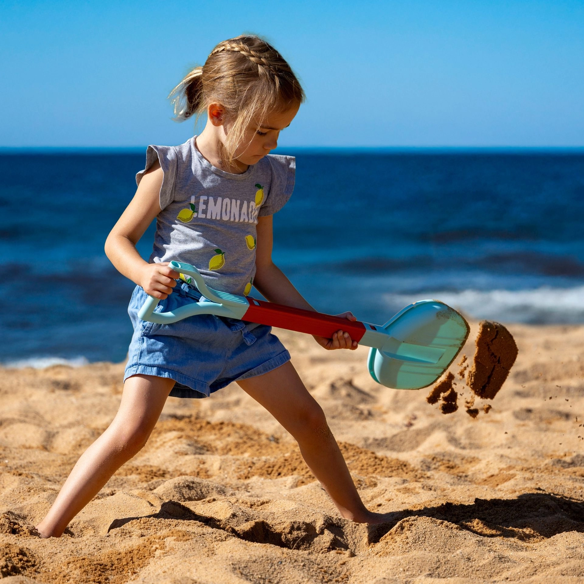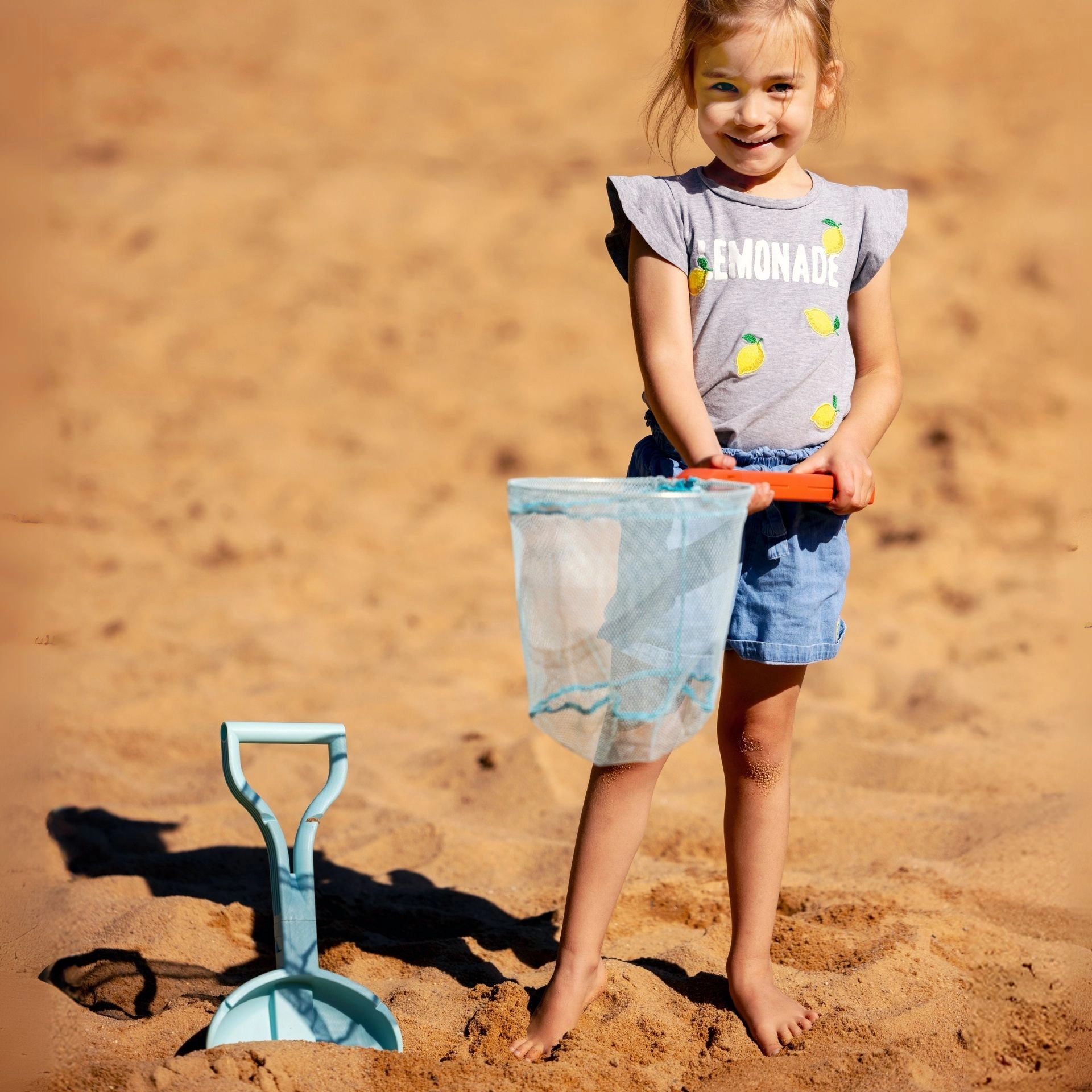 Ten praktyczny plażowy zestaw 2w1 to świetny pomocnik do dziecięcych zabaw na plaży, nad stawem i w basenie. Łączy funkcję łopaty do kopania i modelowania piasku z siatką do łowienia muszelek i drobnych skarbów. Dzięki teleskopowemu wysuwowi z 40 cm do 70 cm łatwo dopasowuje się do wzrostu dziecka i zapewnia lepszy zasięg.