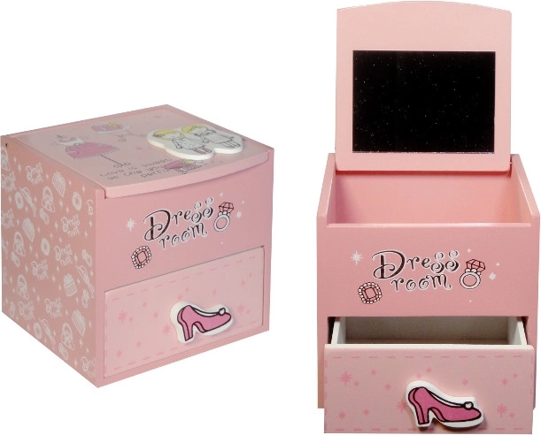 Różowa drewniana szkatułka z napisem „Dress room” zachwyci małe elegantki. Dzięki wbudowanemu lusterku i praktycznej szufladce dzieci mają wszystkie skarby w jednym miejscu – od pierścionków i bransoletek po drobne spinki.