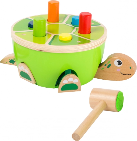 Żółwik z kolorowymi kołkami wciąga dzieci w sprytną mechaniczną zabawę: gdy wbiją jeden kołek, kolejny automatycznie się wysuwa. Podczas uderzenia poruszają się także nogi, głowa i ogon żółwia, więc każde stuknięcie nagradzane jest zabawnym efektem i natychmiastową informacją zwrotną.