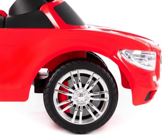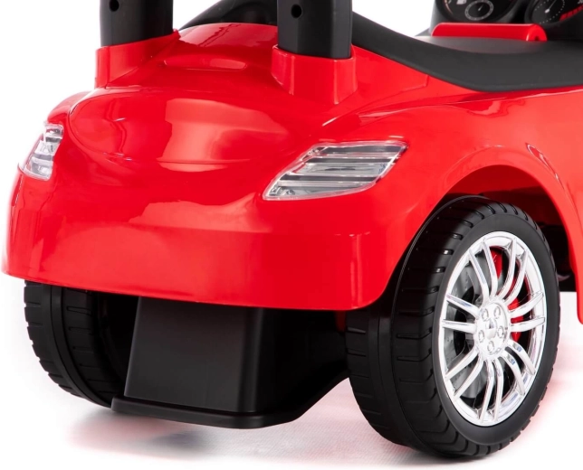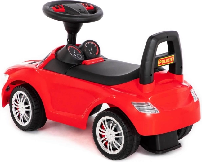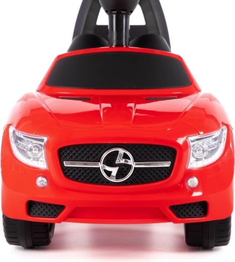 Stylowy dziecięcy jeździk SuperCar w czerwonym kolorze oferuje stabilną konstrukcję, wygodne siedzisko z oparciem oraz kierownicę z efektami dźwiękowymi (klakson, dźwięk silnika, melodie). Pod siedziskiem znajduje się praktyczny schowek na drobiazgi. Jazda na jeździku wspiera rozwój równowagi, koordynacji i motoryki. Maksymalne obciążenie to 50 kg, zasilanie dźwięków: 2× AA (zalecane alkaliczne).